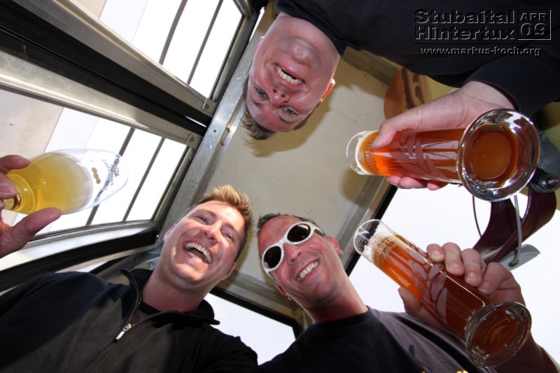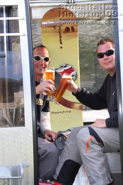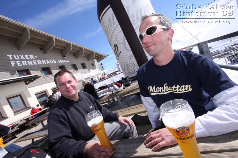 In der Gondel morgens nach oben machten wir Bekanntschaft mit einem Promoteam von Erdinger, die einen Stand am Tuxer Fernerhaus (2660m) für dieses Wochenende bertreuten. Dort haben wir auch Pause gemacht. Es gab ein Gewinnspiel, einen Dreikampf mit eben drei verschiedenen Spielen. Da es um Punkte ging, werden wir nachträglich benachrichtigt, ob wir etwas gewonnen haben 🙂 Sah ganz gut aus!