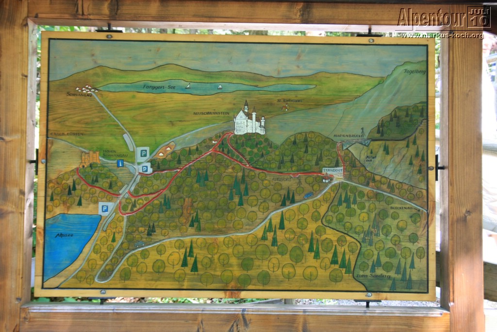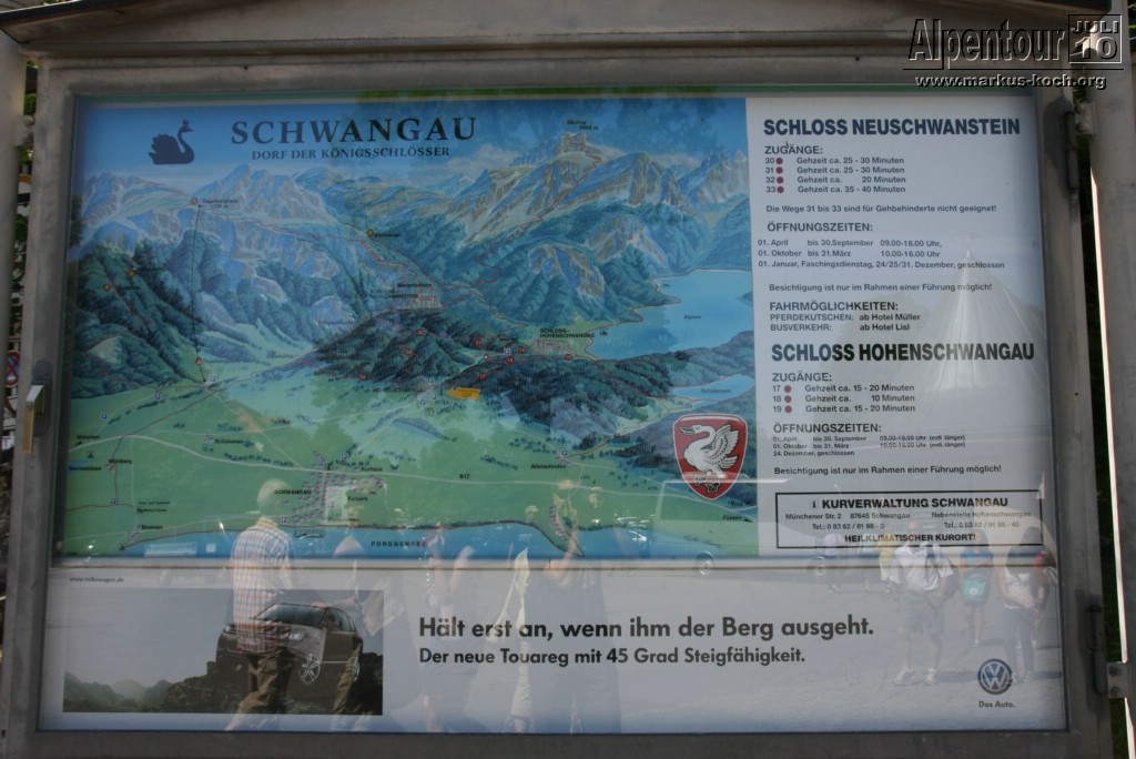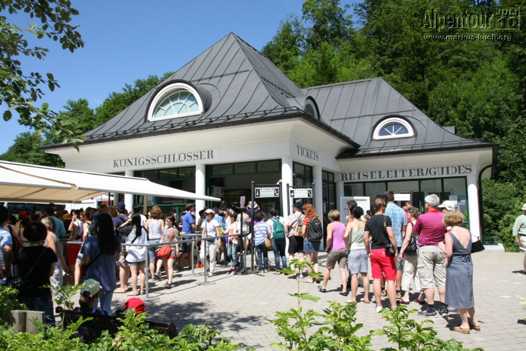 Nach dreistündiger Fahrt sind meine Freundin Marie-Louise und ich in Schwangau angekommen. Was für eine angenehme Fahrt, seit die A7 bis Füssen ausgebaut worden ist. Gottseidank haben wir unsere Eintrittskarten für das Schloss Neuschwanstein vorab reserviert. Ohne Reservierung steht man da gut zwei Stunden an.