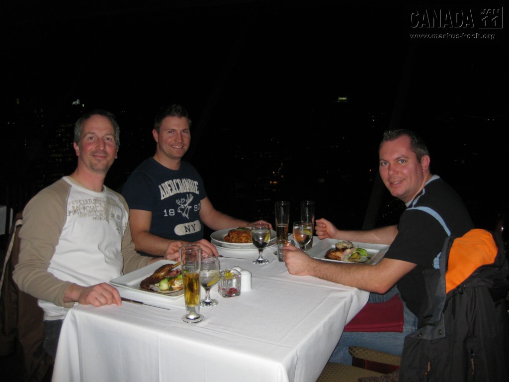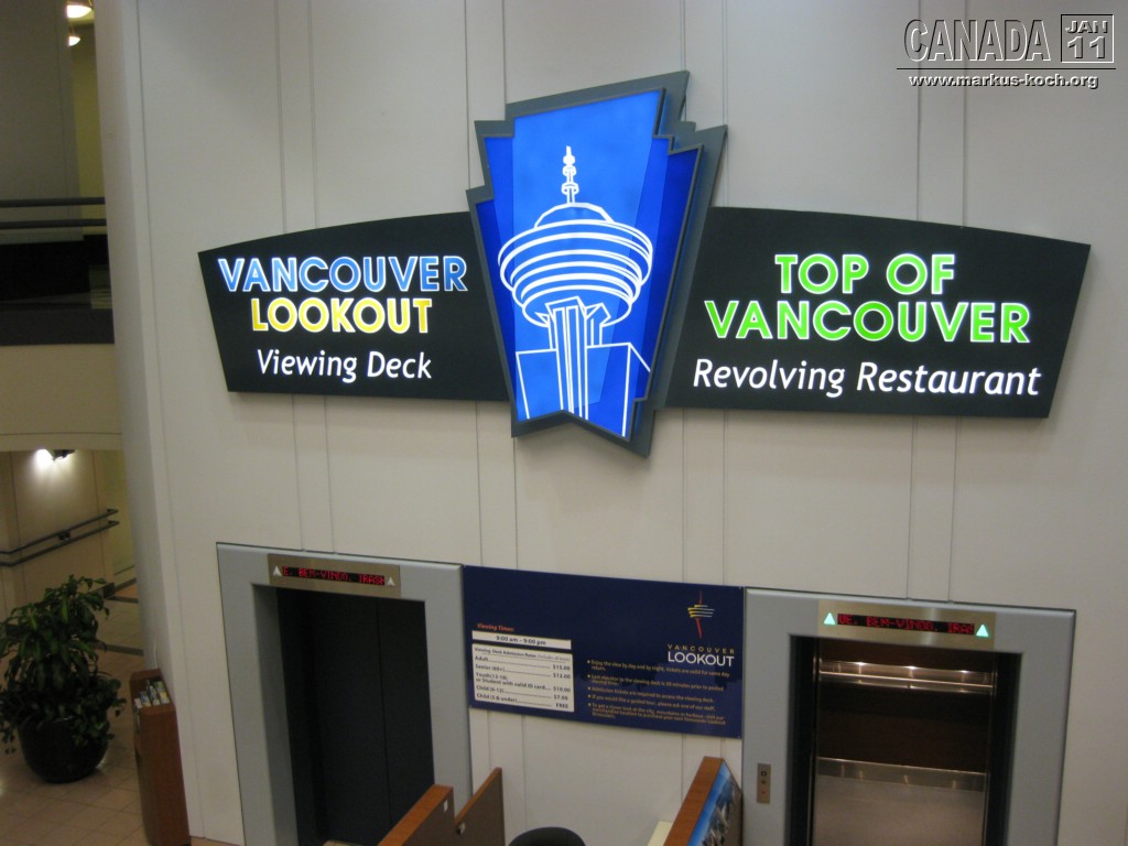 Nach 2-3 Stunden Aufenthalt dort ging es zu Fuß an der Waterfront zum Olympischen Feuer (das ja jetzt wieder aus ist) und von da weiter ins Gastown. Als die Frage des Abendessens aufkam und wir ein paar Deutsche in einem Souvenirshop getroffen hatten, stand für uns fest, dass wir unser letztes Abendessen in Canada im Aussichtstower „Top of Vancouver“ einnehmen wollten. Die Wahl hat sich tatsächlich gelohnt. Das während unseren Besuch zweimal drehende Restaurant hat unseren Geschmack voll getroffen. Und die Aussicht bei klasse Weitblick hat sich obendrein gelohnt!