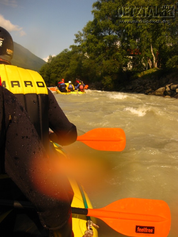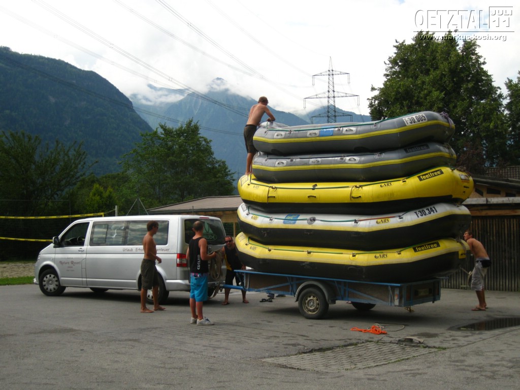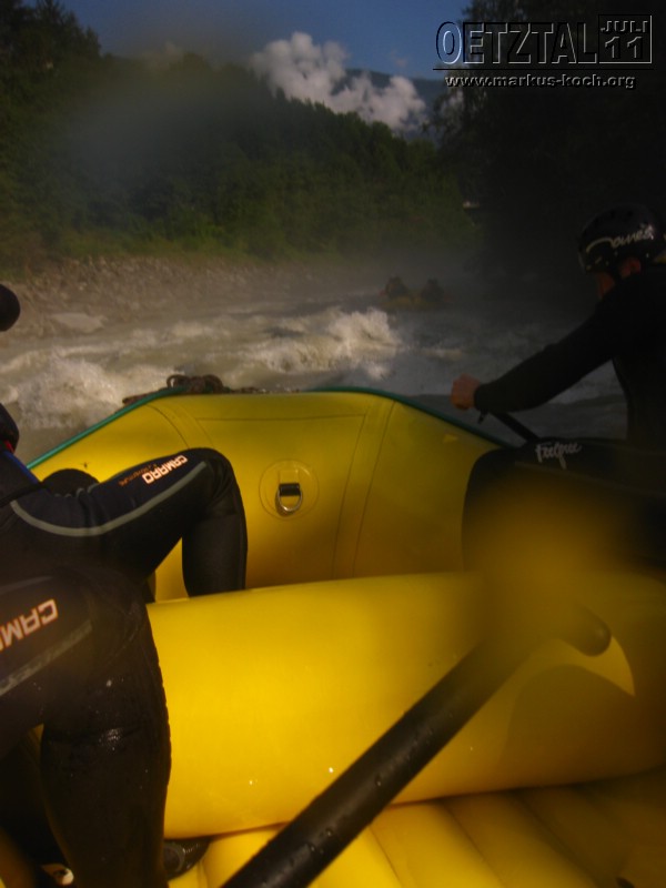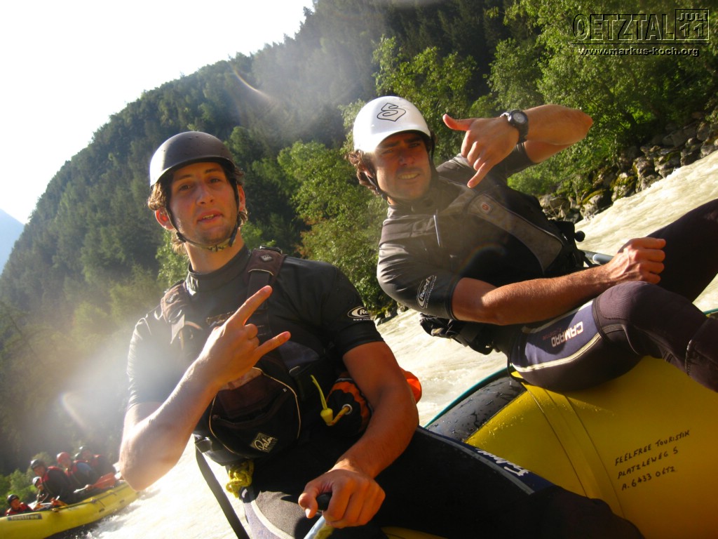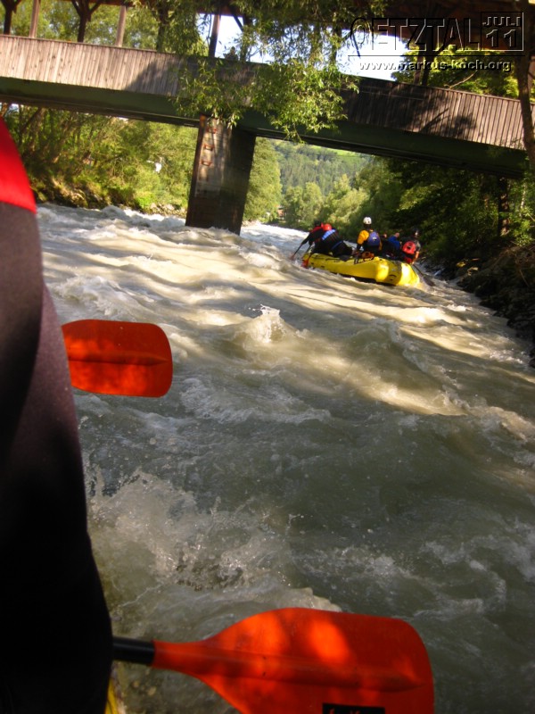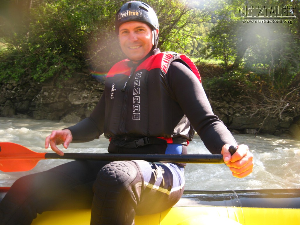 Sonntag: Acht der Jungs haben sich noch eine kleine Steigerung vom Rafting gegeben: Rafting Professional auf der Ache – der Fluß der auch durch Sölden und auch am Adventure Camp vorbeifließt. Deutlich mehr und größere Stromschnellen waren geboten für Volker, Udo, Christian, Michael, Achim, Christoph, Thommy und mich. Es hat super Spaß gemacht, nur war leider ein Guide mir bei einer ganz tiefen Stromschnelle von Hinten auf meinen Unterschenkel geschleudert, sodass ich nun ein Problem mit meinem linken Sprunggelenk habe, was aber in Deutschland untersucht wird.