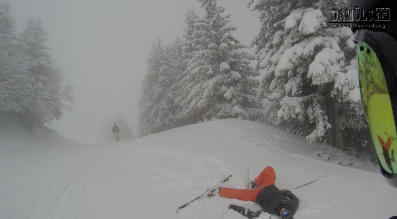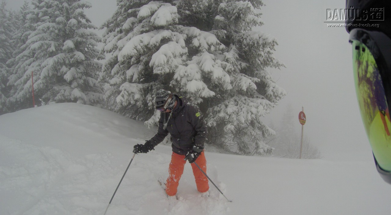 Besonders toll war der Sonntag morgen, zwar in höheren Lagen keine Sicht durch Wolken, aber dort wo man etwas gesehen hat, konnten wir ca. 20 cm frischen Powder den Kampf ansagen. Absolut Klasse! Sowohl auf den Pisten, die wir teilweise entjungfert hatten, als auch auf den bezuckerten Hängen abseits der Pisten.