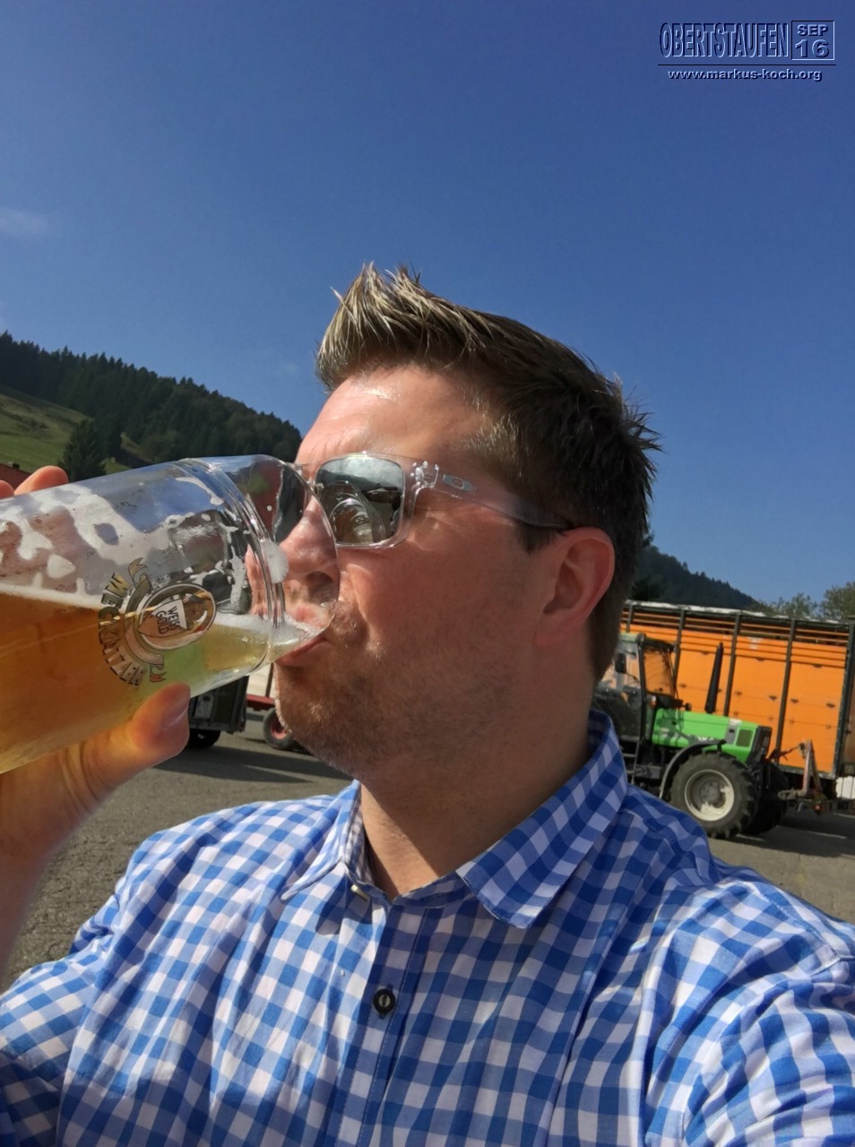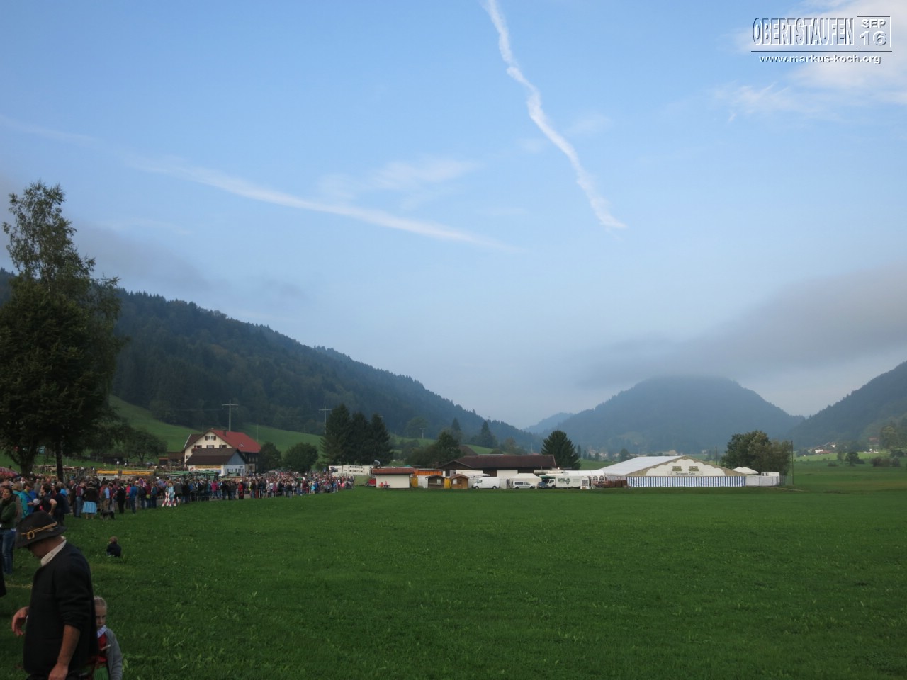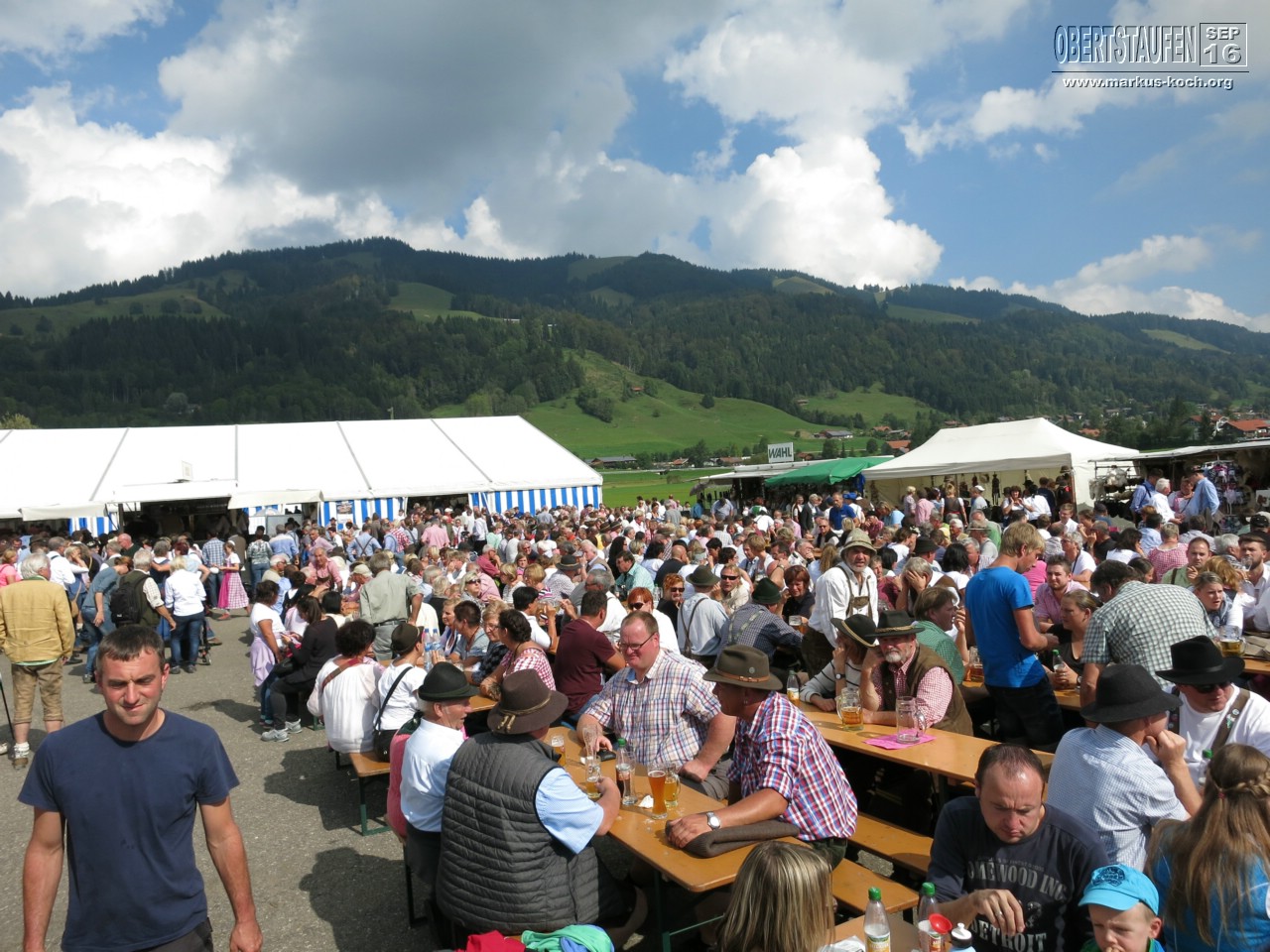 Wir hatten echt super Glück mit dem Wetter und so saßen wir vor dem großen Festzelt am Ende des Kuh-Sammelplatzes im Sonnenschein, tranken Radler-Maß und aßen Weißwürste.