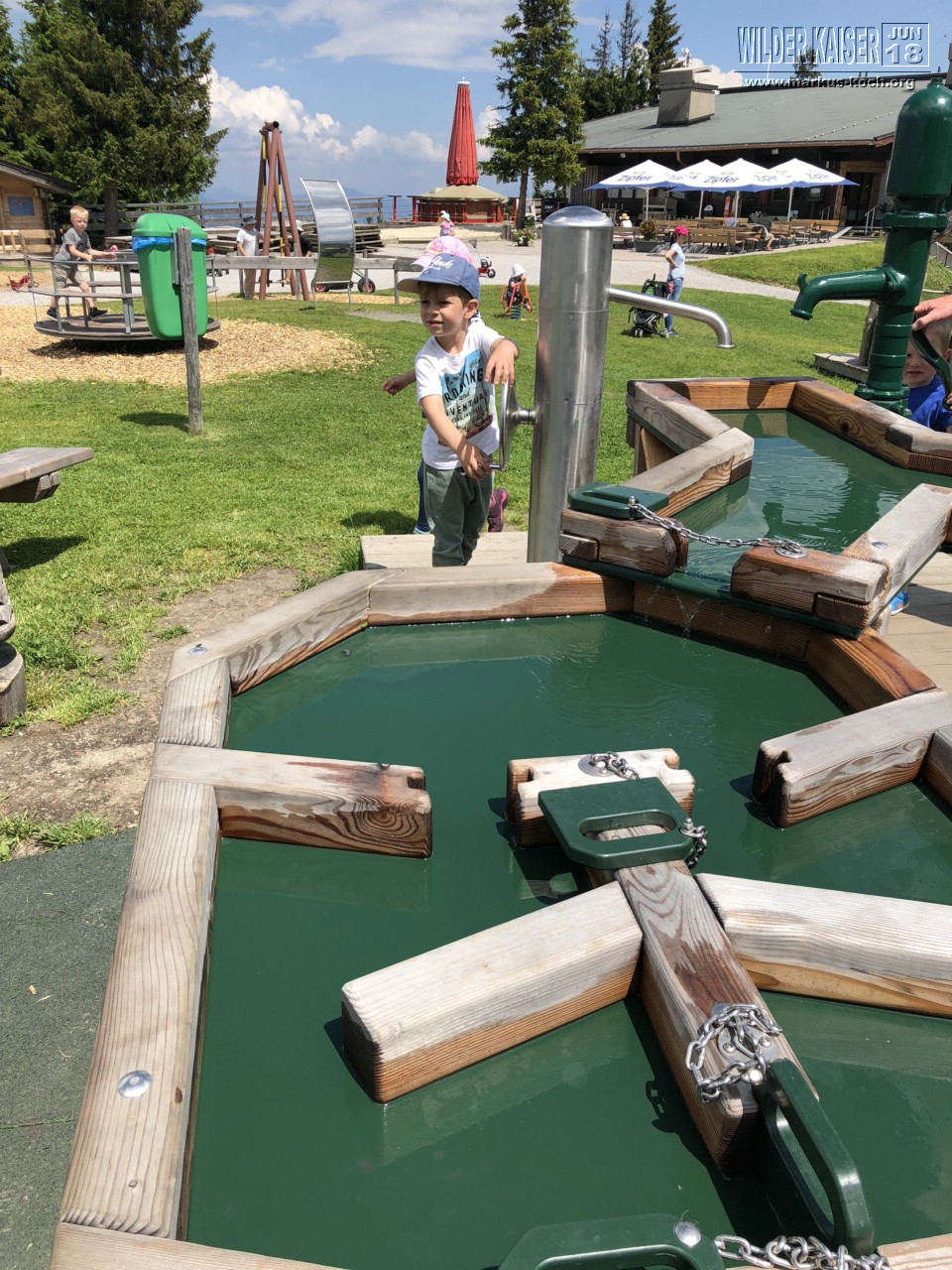 Trotz Ferienhaus wollten wir mal auf dem Gipfel der Hohen Salve (per Gondel) frühstücken. Danach hielten wir uns in der Erlebniswelt „Hexenwasser“ in Hoch-Söll auf. Luca gefiel besonders ein Holzschiff, mit dem er sich selbständig bewegen konnte.