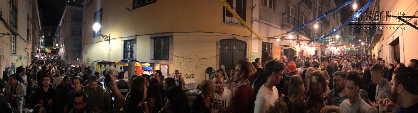 Eigentlich wollte ich dann um 23:30 Uhr zurück ins Bett, aber dann stand da ausgerechnet ein E-Tretroller vor meinen Füßen. App downgeloaded, bezahlt und damit noch kurz rumgefahren. Hängengeblieben bin ich bei einer Gasse, wo auch eine Standseilbahn fuhr (jedoch nicht mehr nachts). Angelockt wurde ich von feiernden Menschen. Sao Joao heißt das heilige Fest Portugals, welches im Juni überall & zu jeder Uhrzeit gefeiert wird. Es riecht auch ständig nach Grill (gegrillte Sardinen).