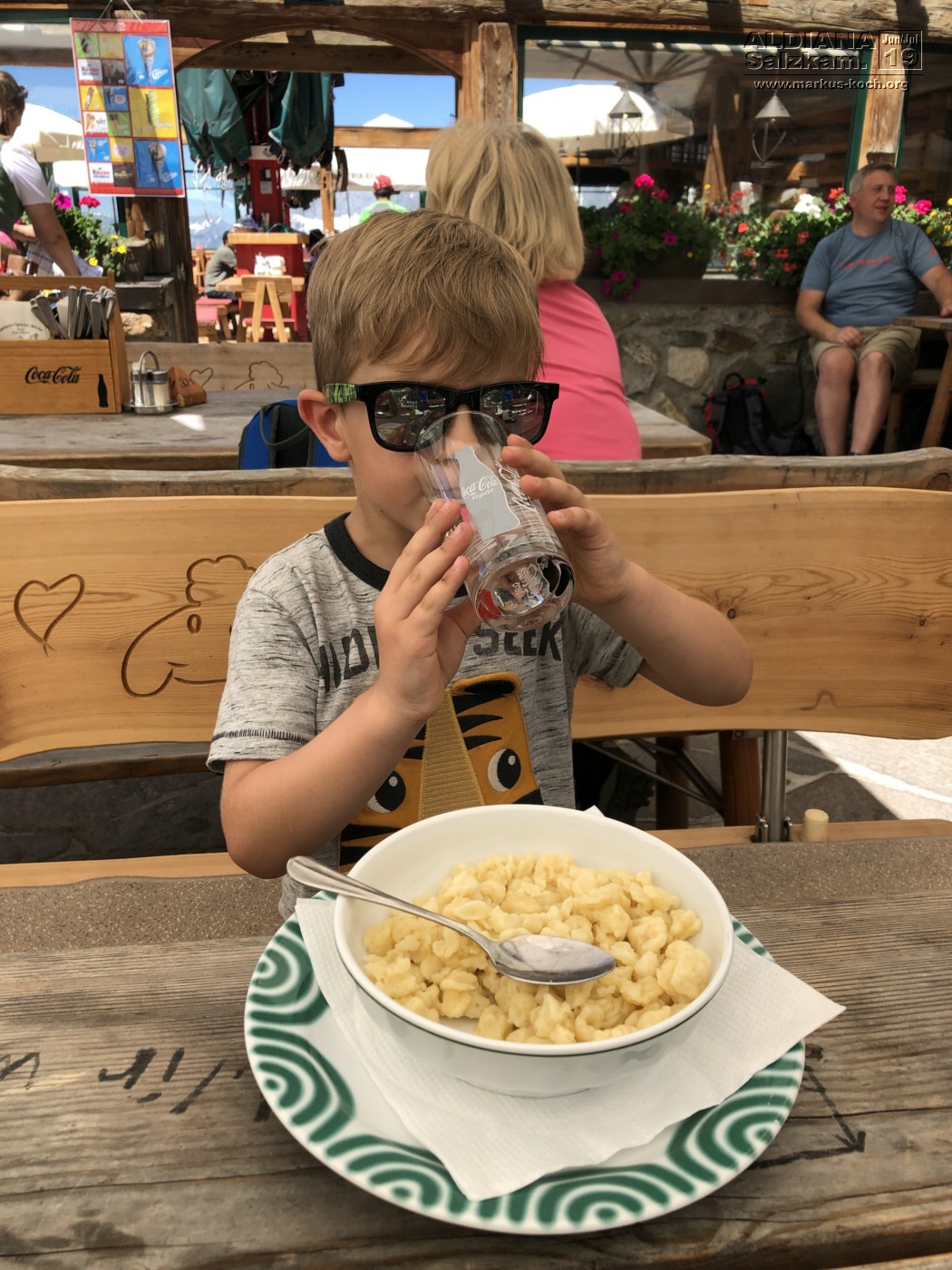 Wieder im Tal, nach einer Open Air Talfahrt in einem auf der Gondel angebrachtem Korb (genial!!!), machten Luca und ich noch eine kleine Wanderung zur Brand Alm. Bis auf ein paar Diskussionen hat er das echt ganz toll gemacht. Es gab Spätzle für ihn zu Mittag. Frisch gestärkt ging es wieder zum Parkplatz zurück.