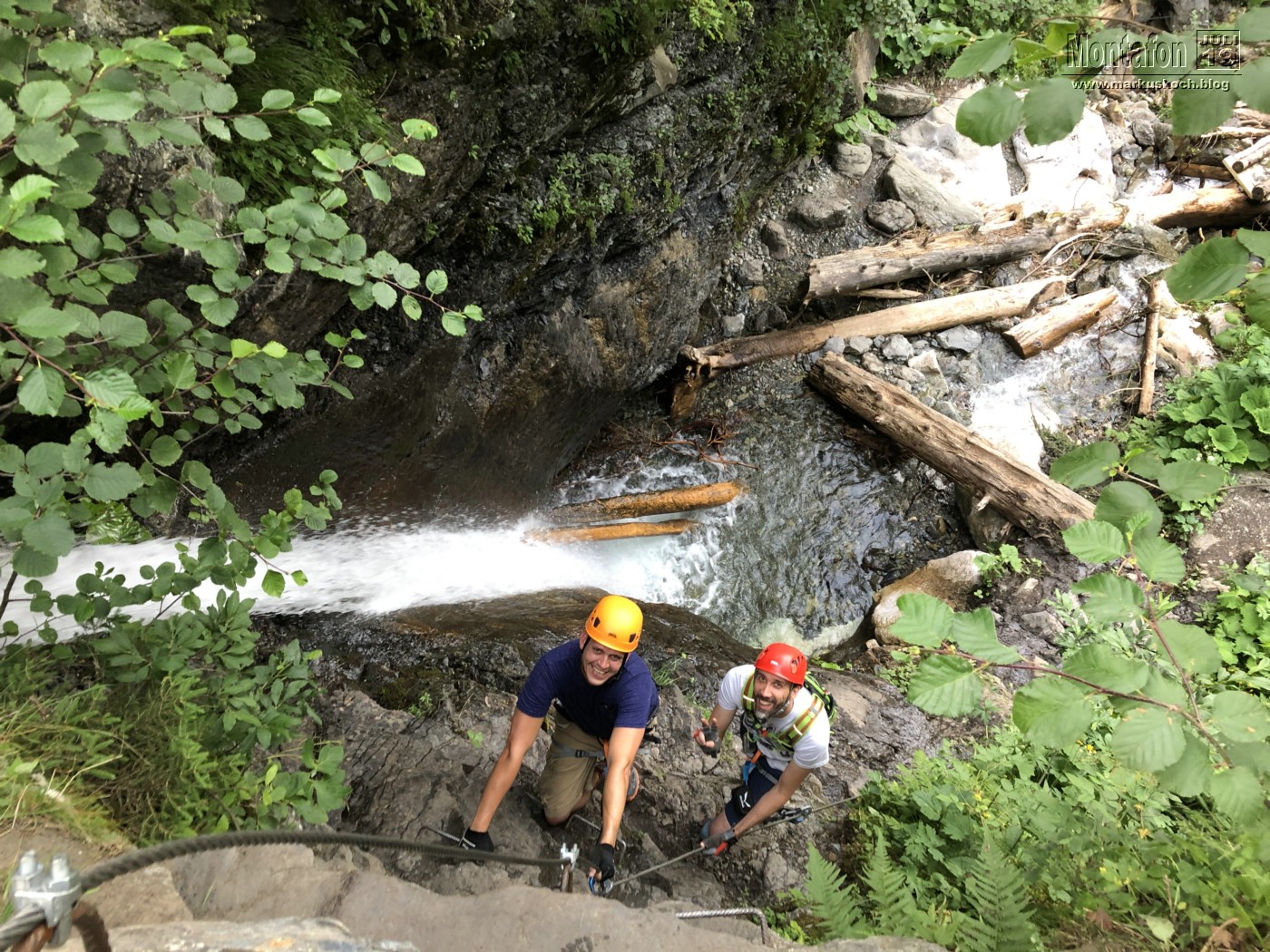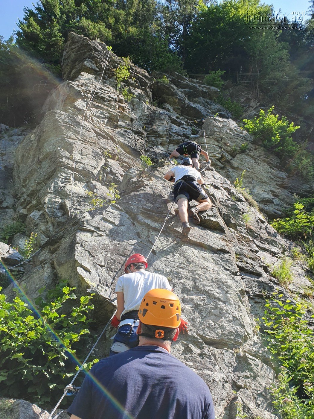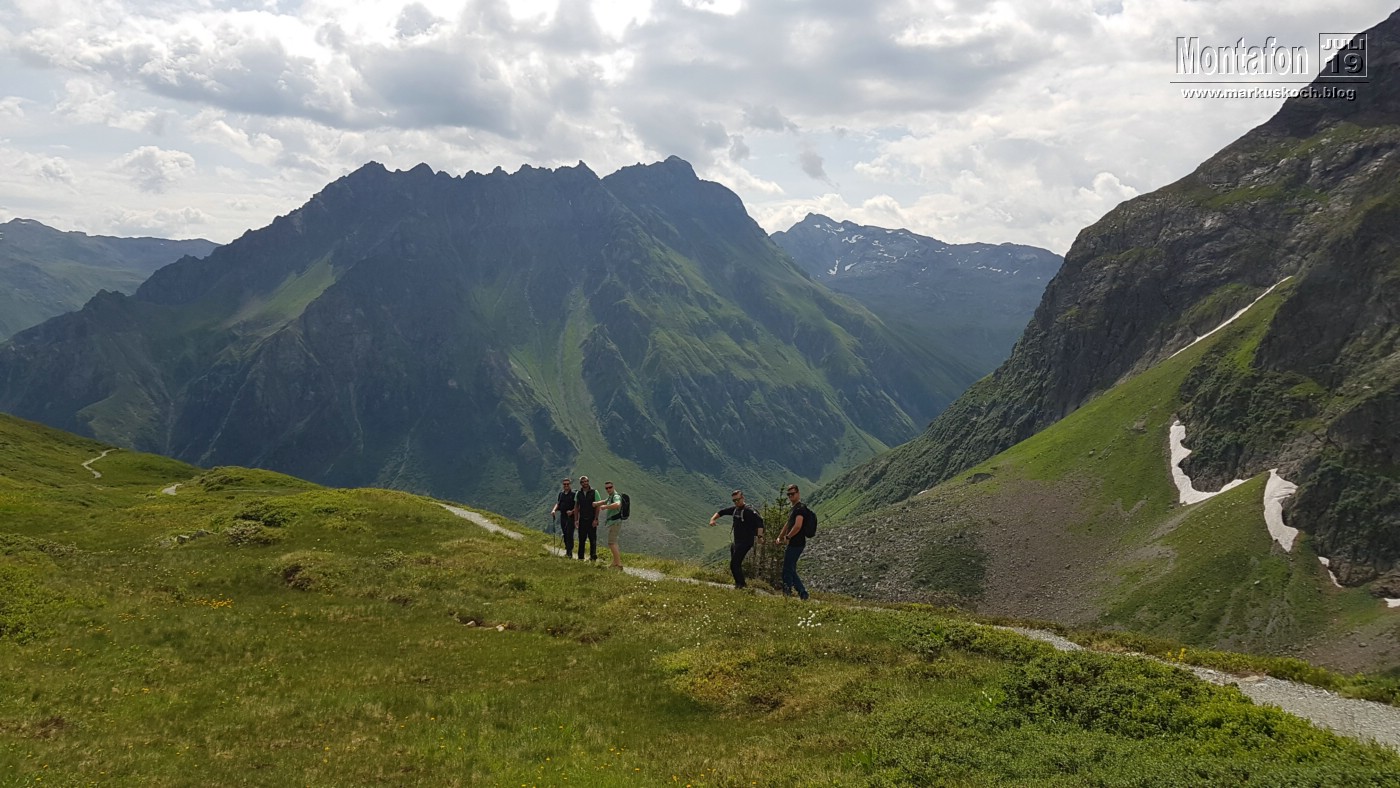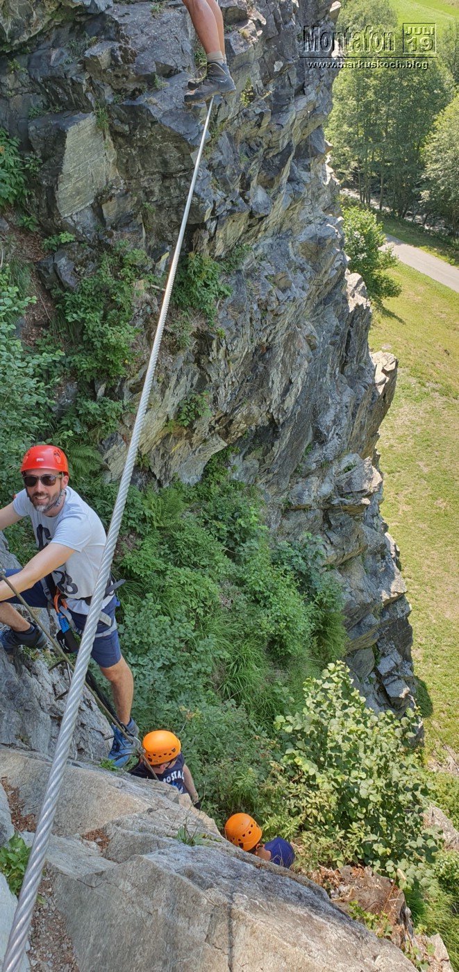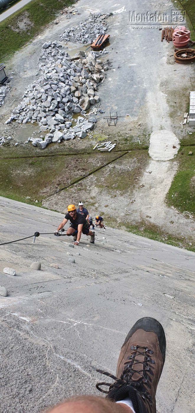 Dazu kam es auch gleich am ersten Tag. Keiner außer mir in diesem Team war je an einem Übungs-Klettersteig Rifa im Tal bei Gaschurn und durch meine Erfahrung habe ich den Trupp eingewiesen und gezeigt wie man einen KS meistern kann. Es stellte sich heraus, dass er gar nicht so einfach war, wie ursprünglich gedacht, aber alle hatten es gepackt und waren begeistert davon.