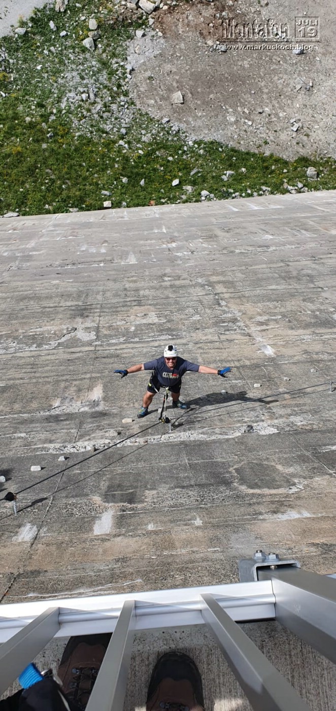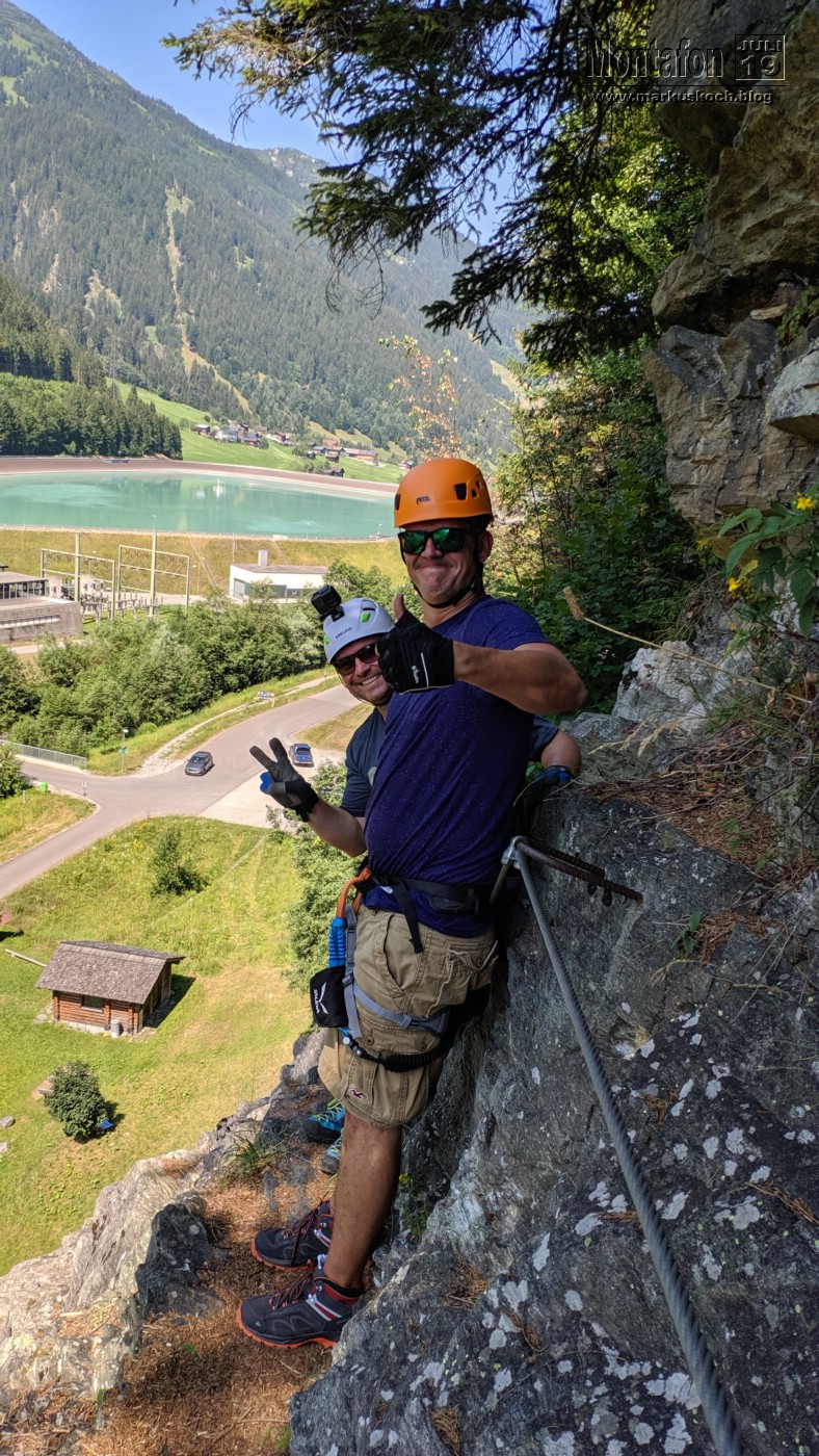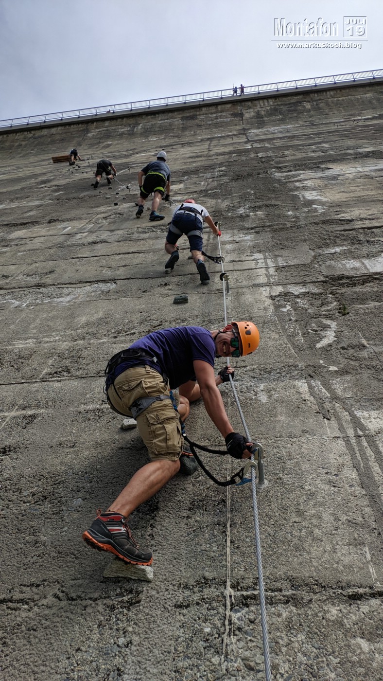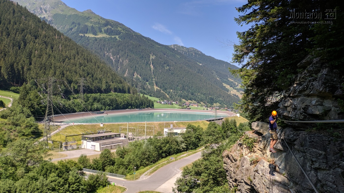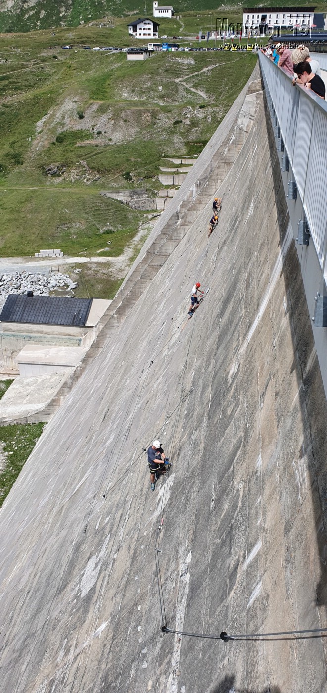 Deshalb entschieden wir einen weiteren leichten KS anzufahren. Es ging über wunderschöne Silvretta Hochalpenstraße zum gleichnamigen Stausee. Nach einer Trinkpause an einer Alpe direkt unterhalb, ging es an die Mauer des Stausees. Der Silvretta Stausee KS wurde ganz neu eröffnet. Mit zwei Bänken zum Ausruhen, 3 Seilteilstücke und einem Pendel. Es hat enorm viel Spaß gemacht, 50-60 m über dem Boden an einer Stauseemauer zu klettersteigen.