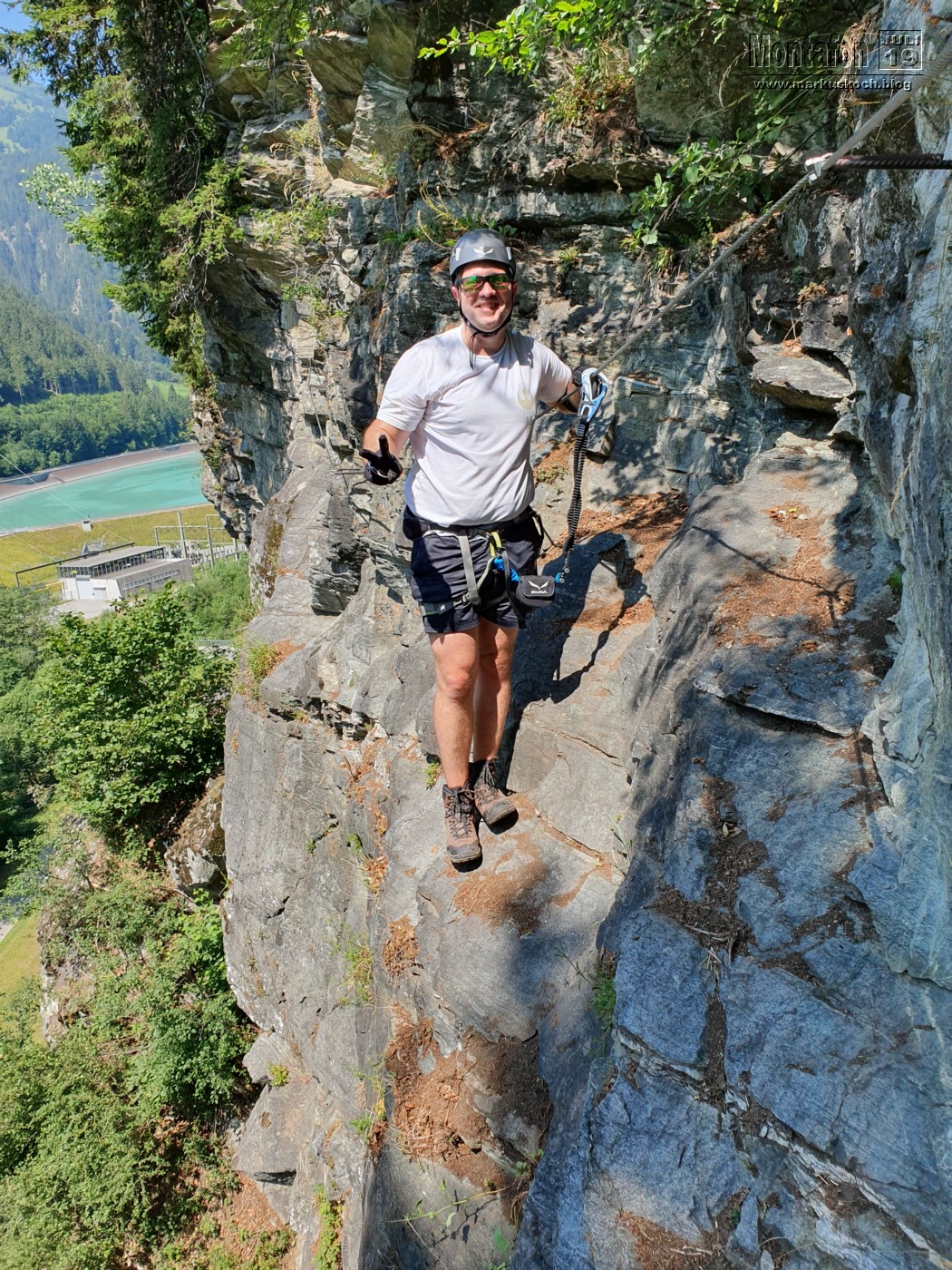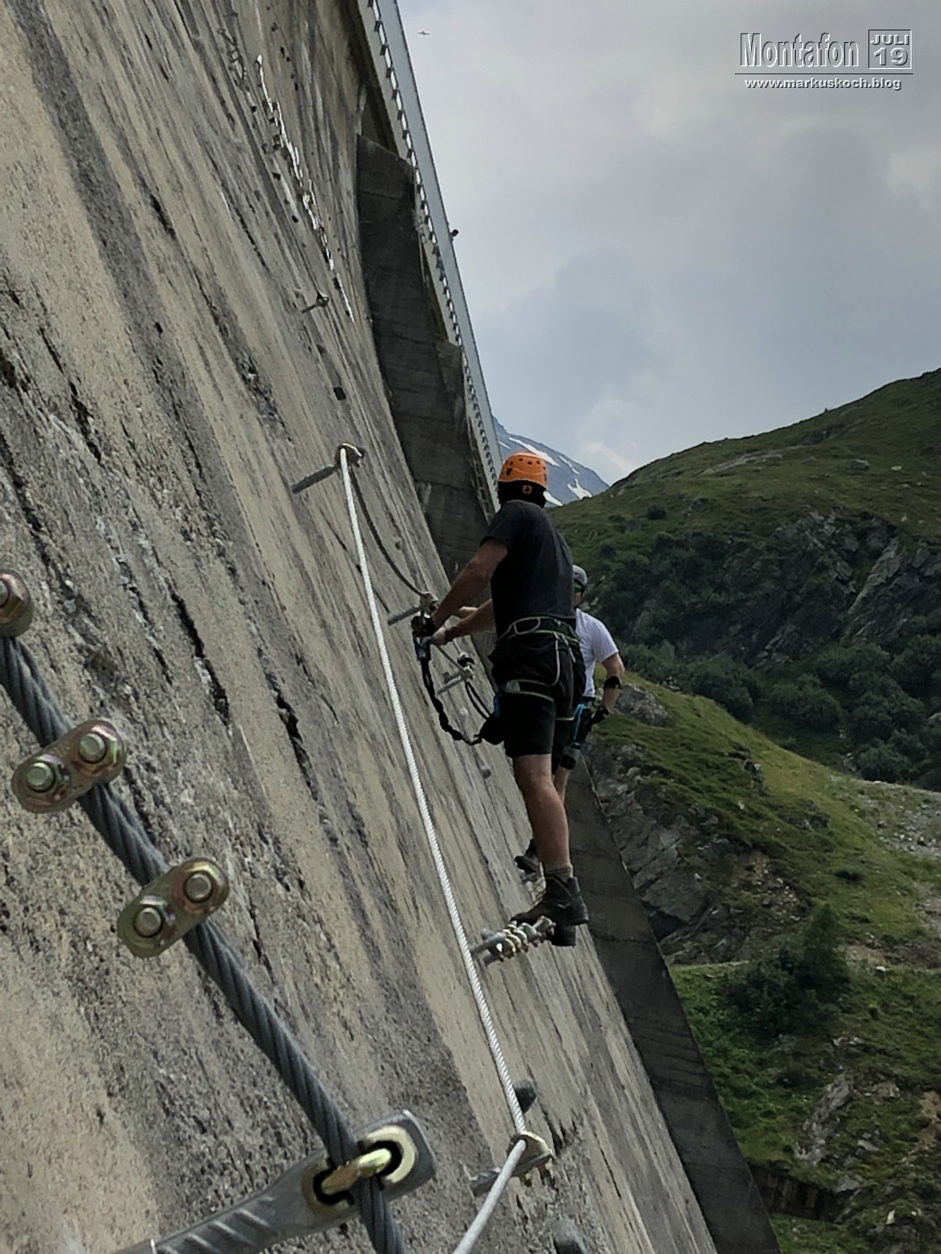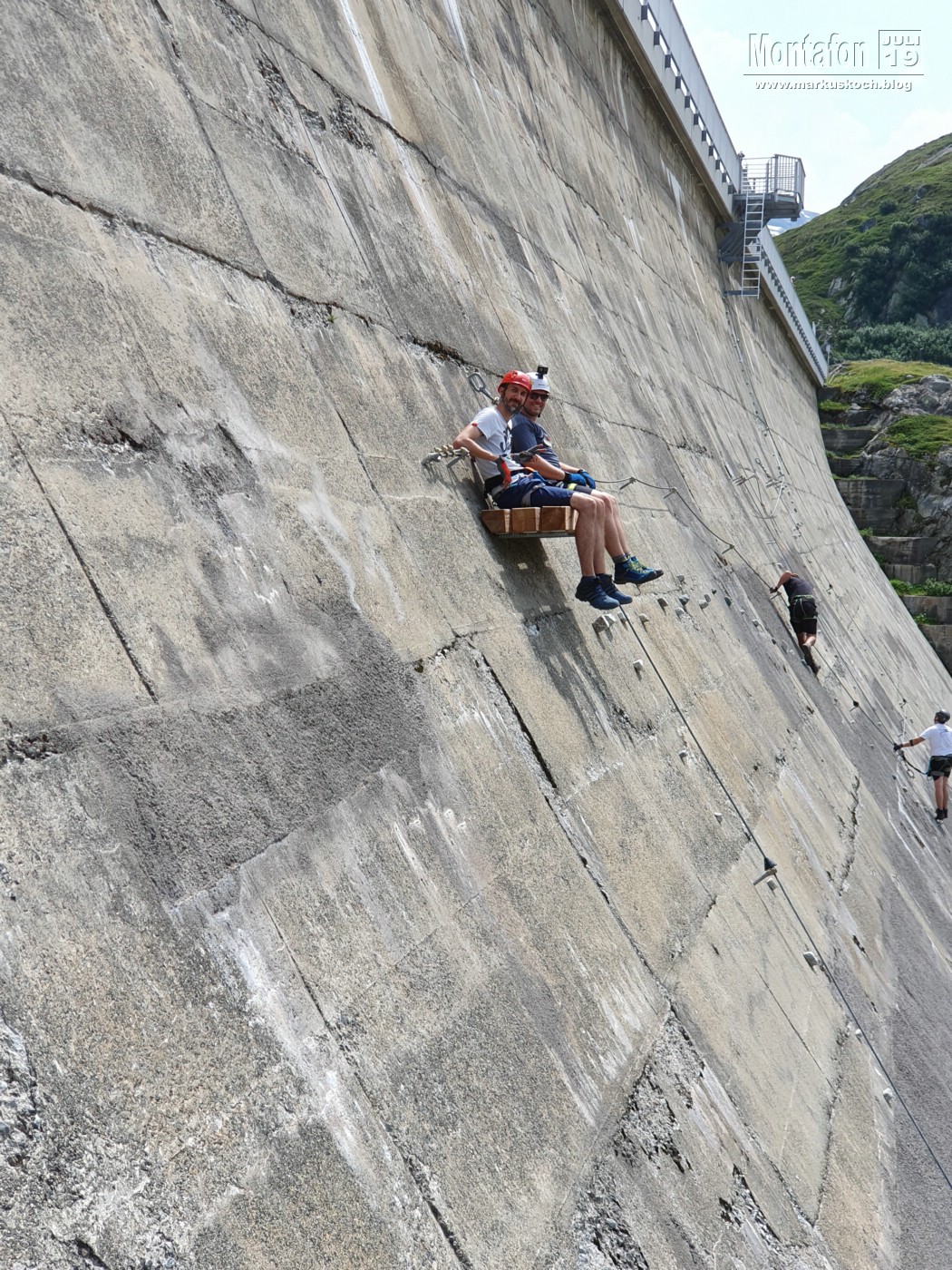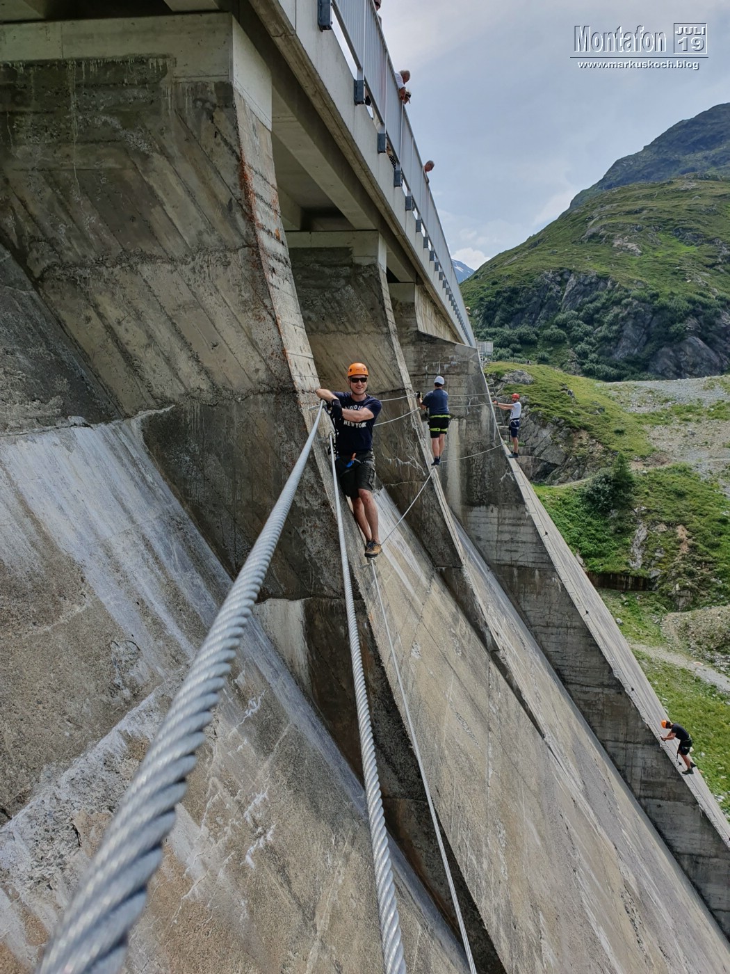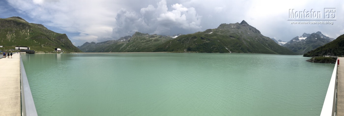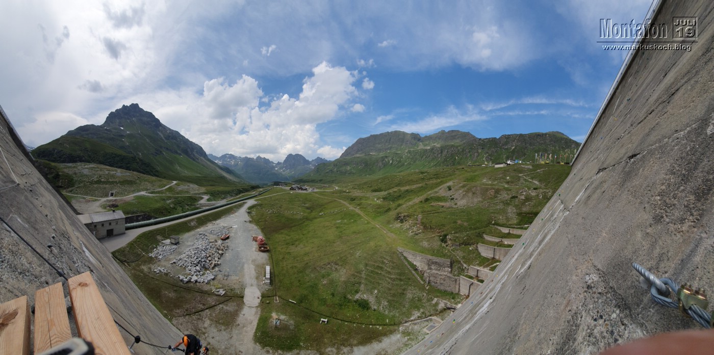 Deshalb entschieden wir einen weiteren leichten KS anzufahren. Es ging über wunderschöne Silvretta Hochalpenstraße zum gleichnamigen Stausee. Nach einer Trinkpause an einer Alpe direkt unterhalb, ging es an die Mauer des Stausees. Der Silvretta Stausee KS wurde ganz neu eröffnet. Mit zwei Bänken zum Ausruhen, 3 Seilteilstücke und einem Pendel. Es hat enorm viel Spaß gemacht, 50-60 m über dem Boden an einer Stauseemauer zu klettersteigen.