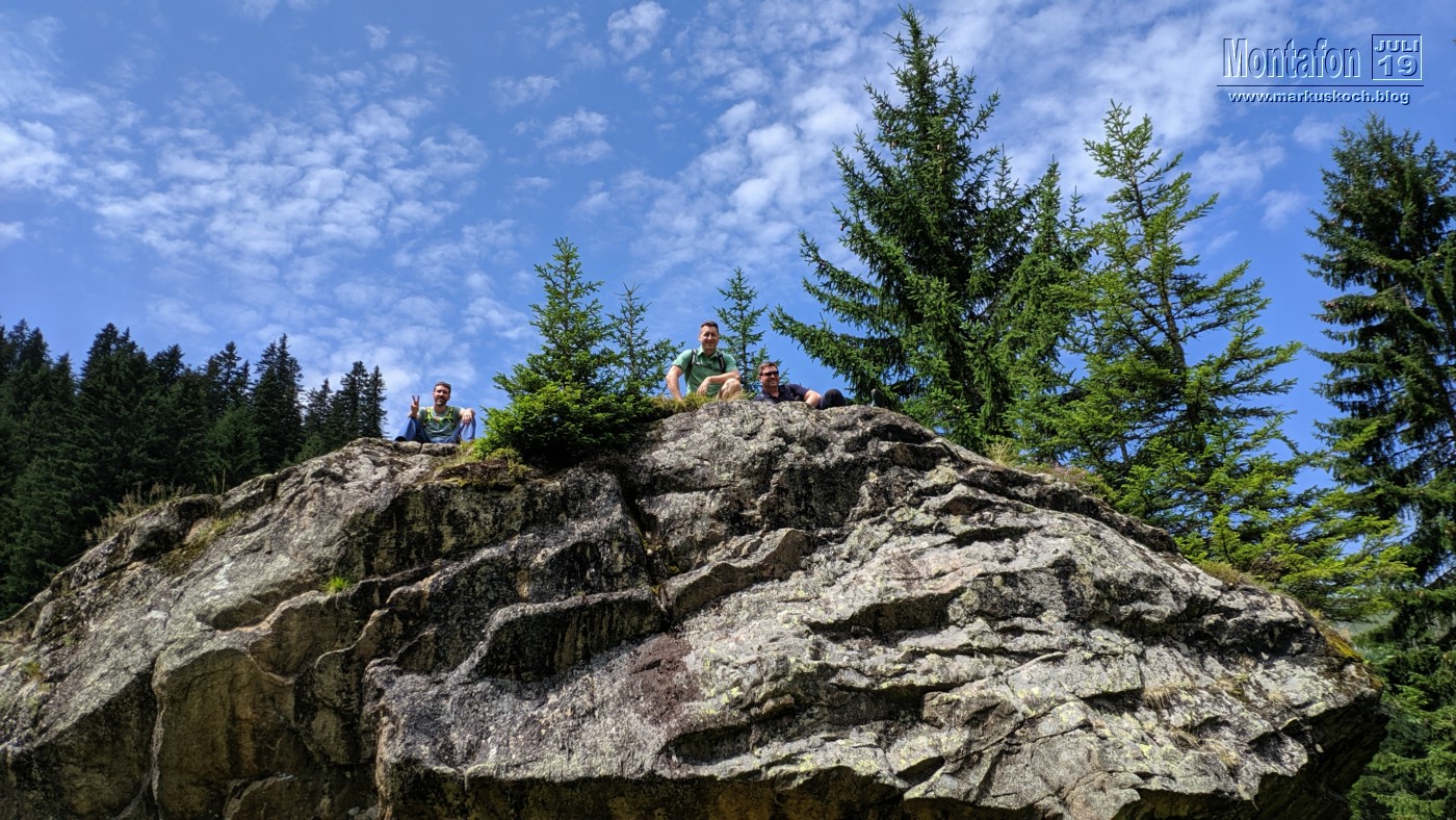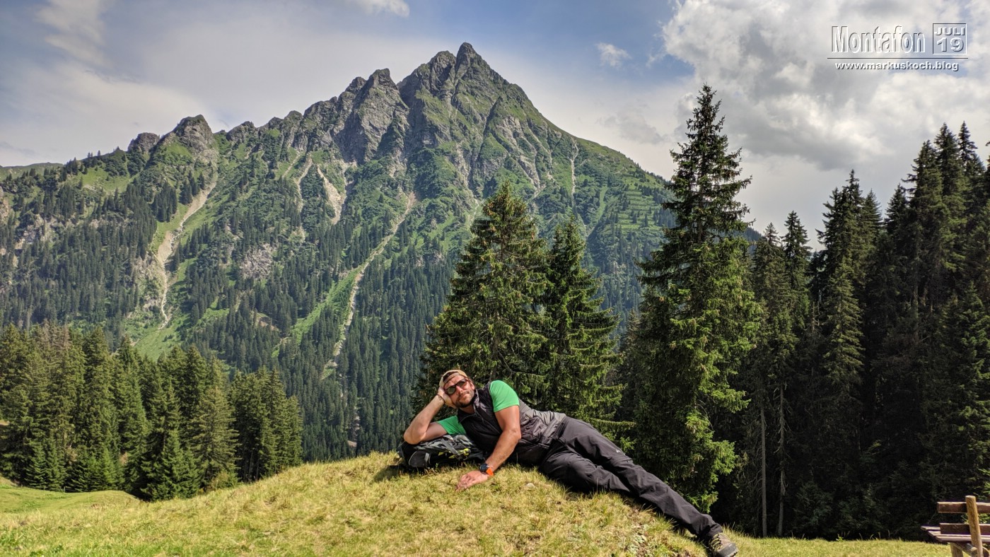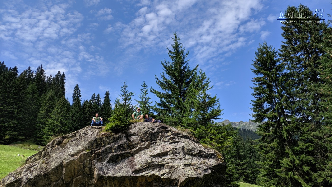 Auf dem Weg ins Tal trennte sich für 2 h die Gruppe. Ralf und Max gingen zur FeWo um anschließend einzukaufen, Matte, Thommy, Tobi & ich liefen querfeldein zur Rongalpe. Wunderschöner Weg mit viel Sonnenschein (wie so oft: Wettervorhersagen in den Alpen sind meist ungenau). An der Alpe wurden wir von einer netten Bedienung empfangen und das Essen hat hier ganz vorzüglich geschmeckt. Die Alpe hat dann wieder die Stimmung der anderen Hütte ganz schnell wieder vergessen gemacht.