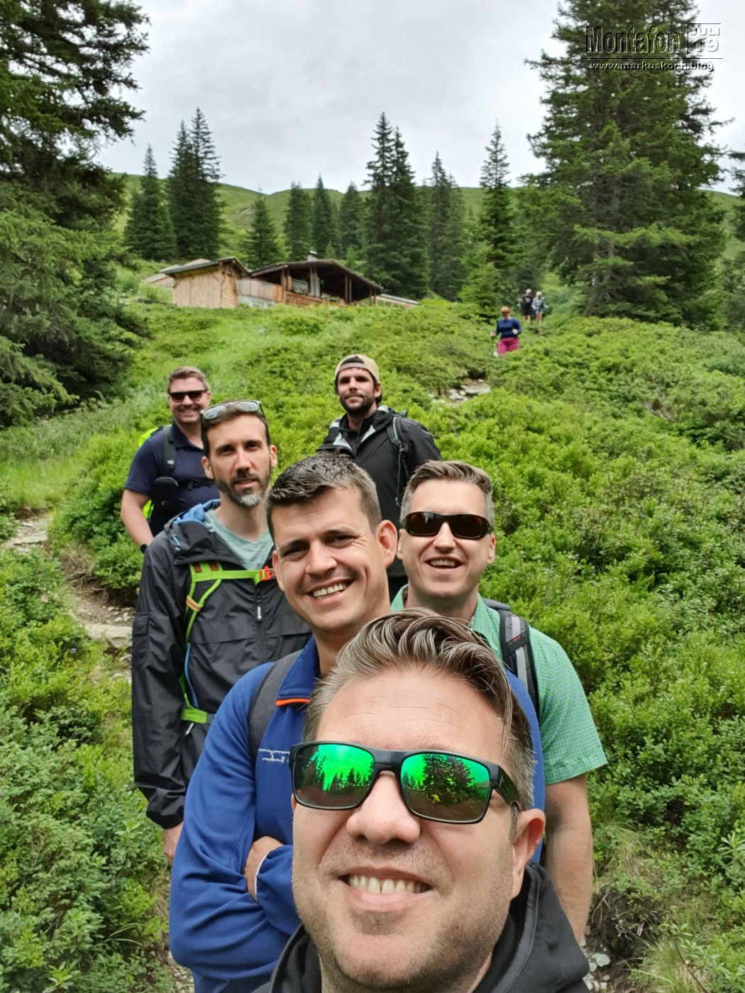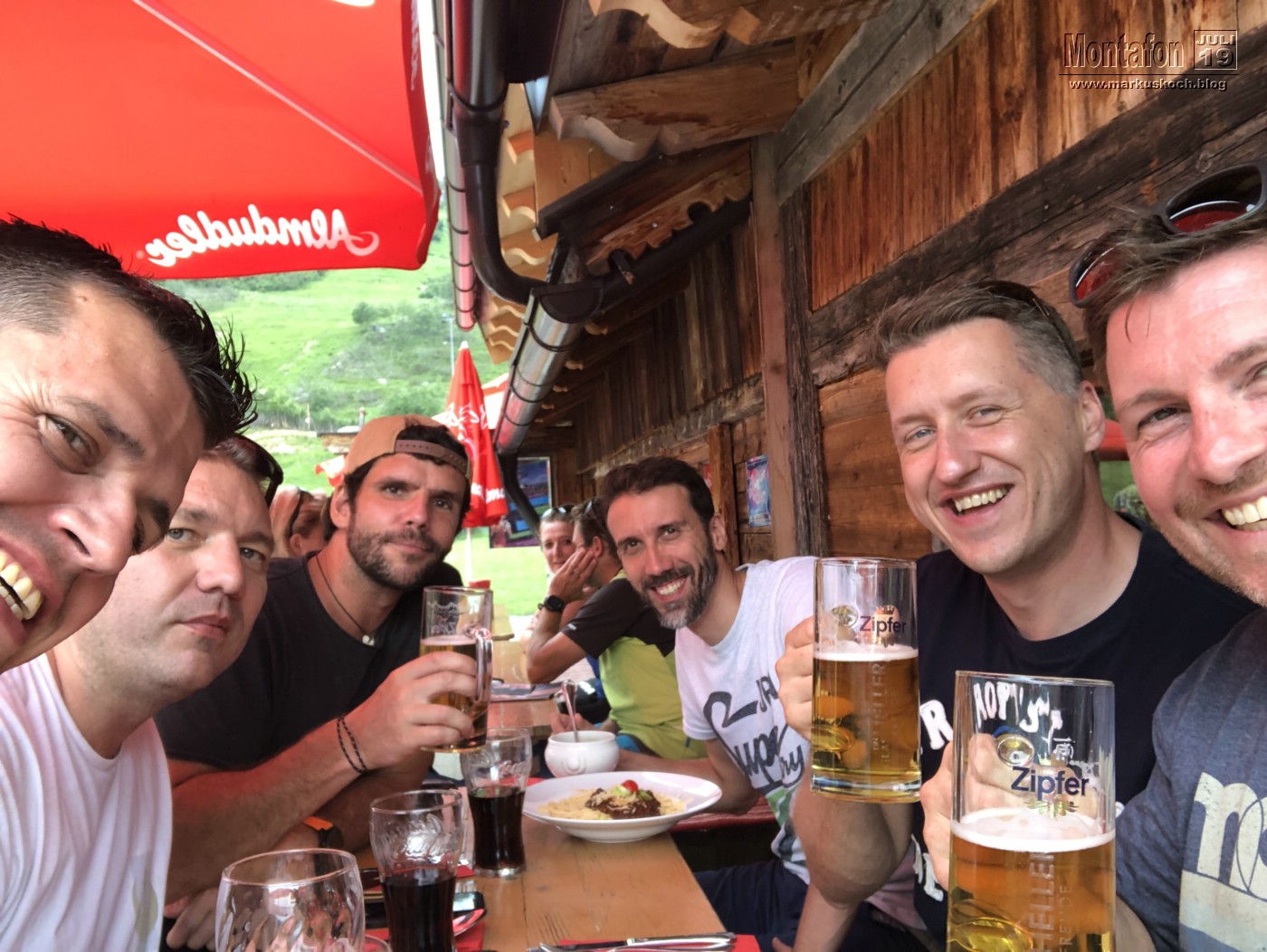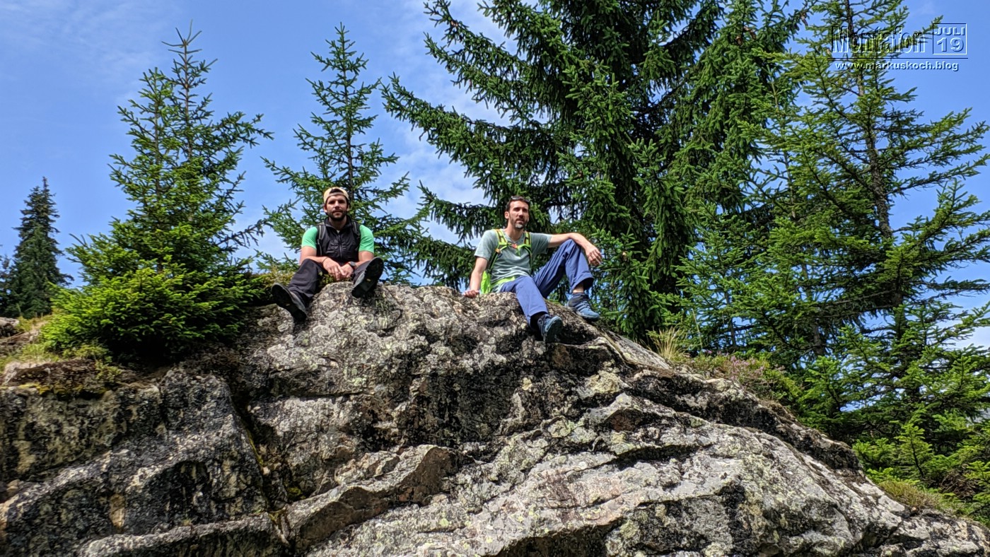 Auf dem Weg ins Tal trennte sich für 2 h die Gruppe. Ralf und Max gingen zur FeWo um anschließend einzukaufen, Matte, Thommy, Tobi & ich liefen querfeldein zur Rongalpe. Wunderschöner Weg mit viel Sonnenschein (wie so oft: Wettervorhersagen in den Alpen sind meist ungenau). An der Alpe wurden wir von einer netten Bedienung empfangen und das Essen hat hier ganz vorzüglich geschmeckt. Die Alpe hat dann wieder die Stimmung der anderen Hütte ganz schnell wieder vergessen gemacht.