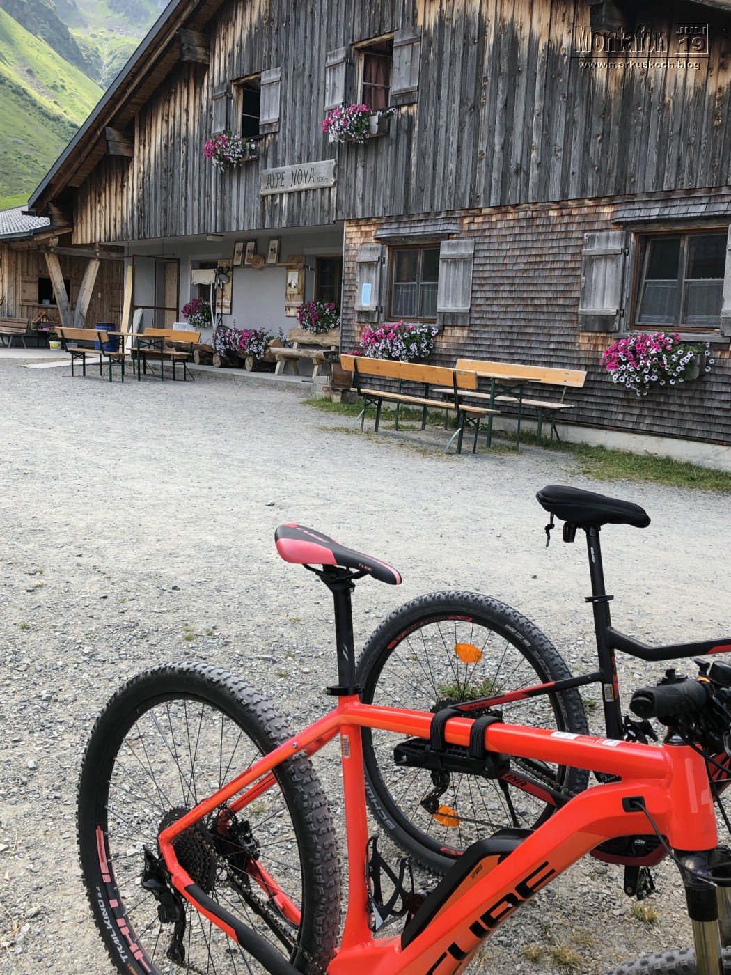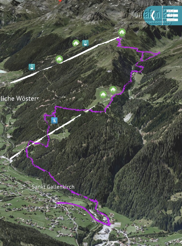 Nach dem Frühstück liehen wir uns Elektro-Mountainbikes um von St. Gallenkirch 1.200 Hm hoch zur Alp Nova zu fahren und dann weitere 300 Hm hoch zu einer Jause an der Bergstation Nova Stoba der Gondel Versettla II. Nach der Stärkung ging es aufgrund des leicht einsetzenden kurzen Regens den gleichen Weg zurück ins Tal. Die Bremsen haben bei diesem Gefälle rot geglüht.