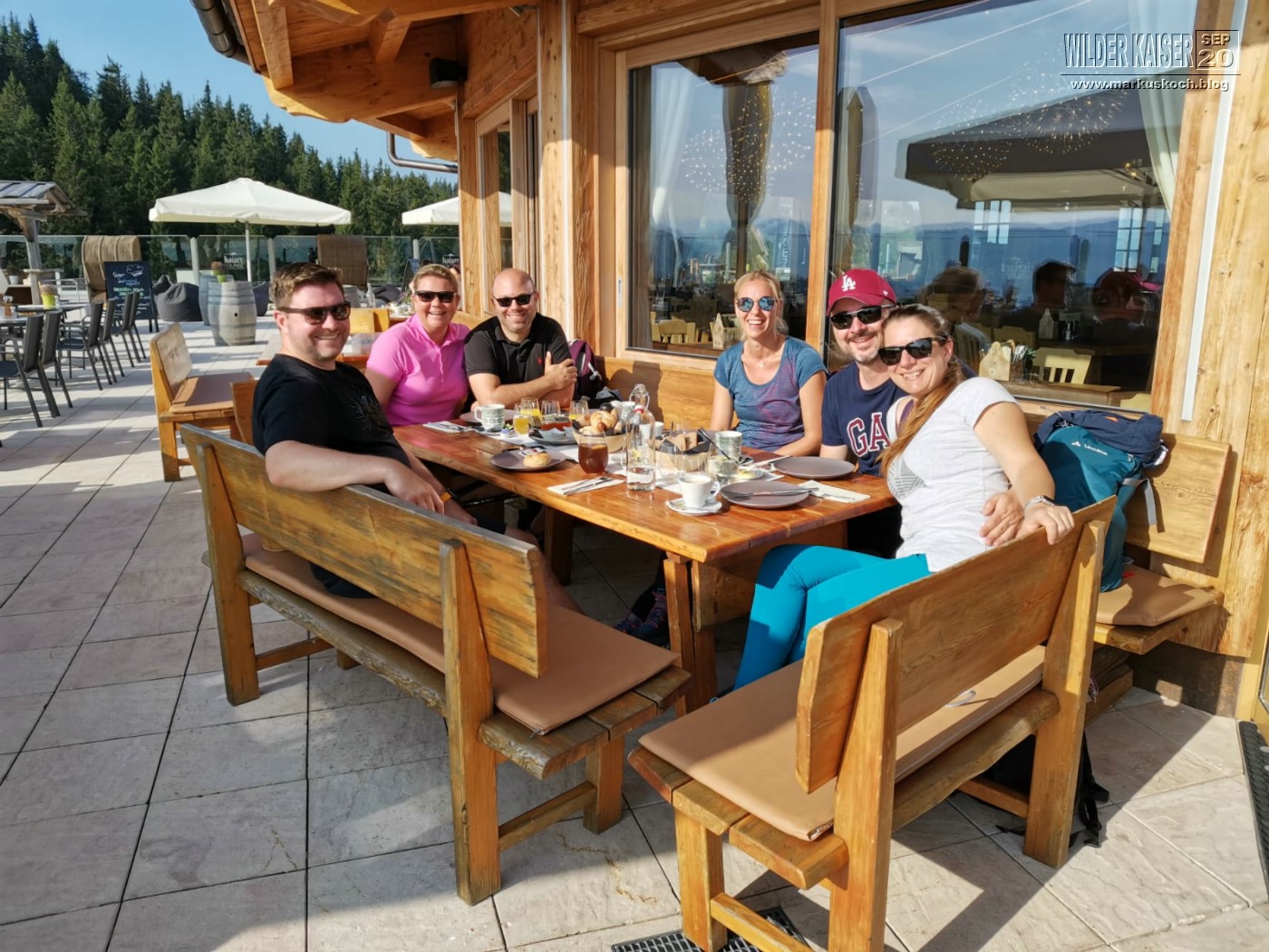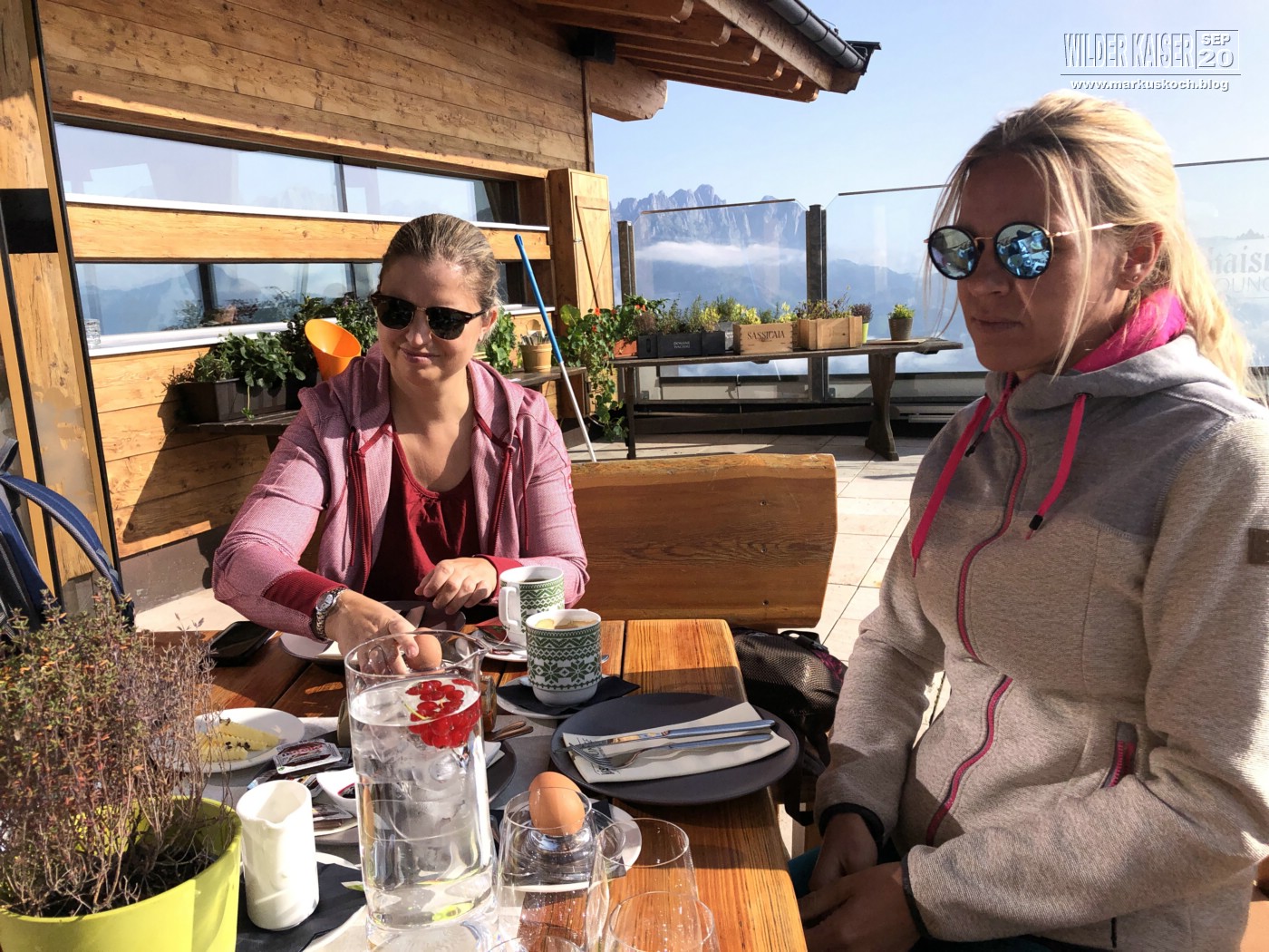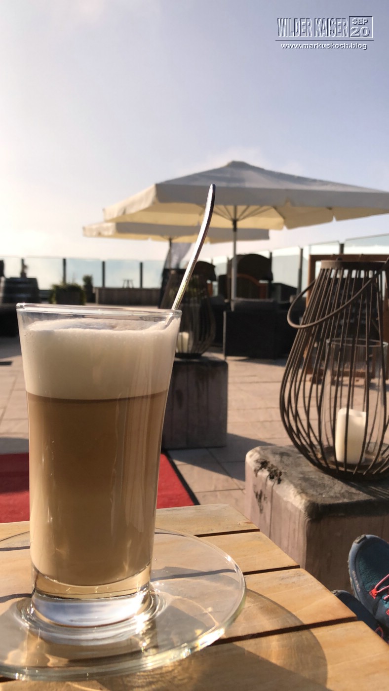 Marie & ich wanderten von der Tirol Lodge direkt in 2 h zum Hartkaiser Gipfel, wo wir in der Kaiser Lounge gemeinsam frühstückten.