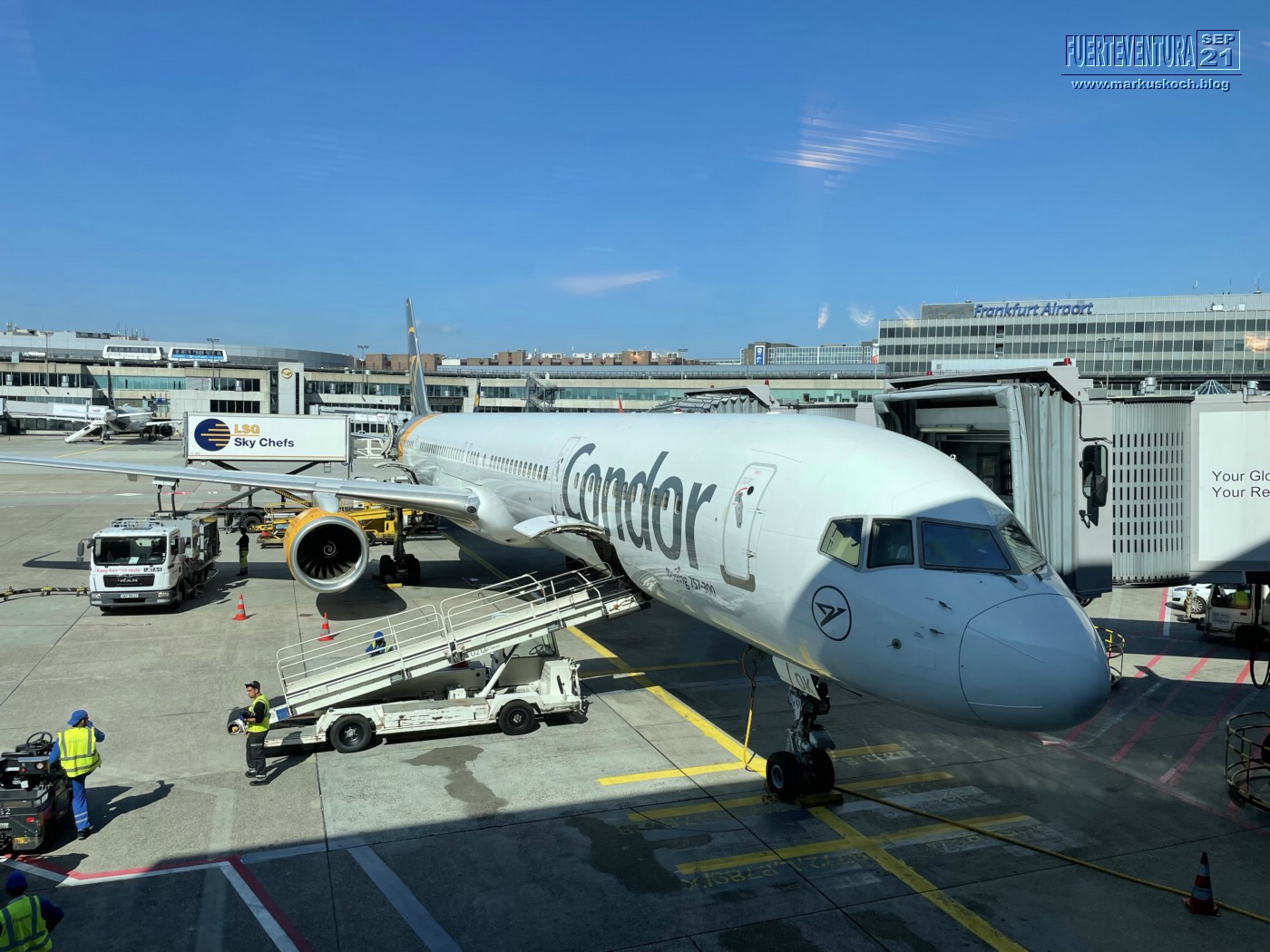 Leider sind wir mit 1,5 h Verspätung erst geflogen, konnten aber immerhin noch in FRA mit Condor DE1403 landen (23:45h).