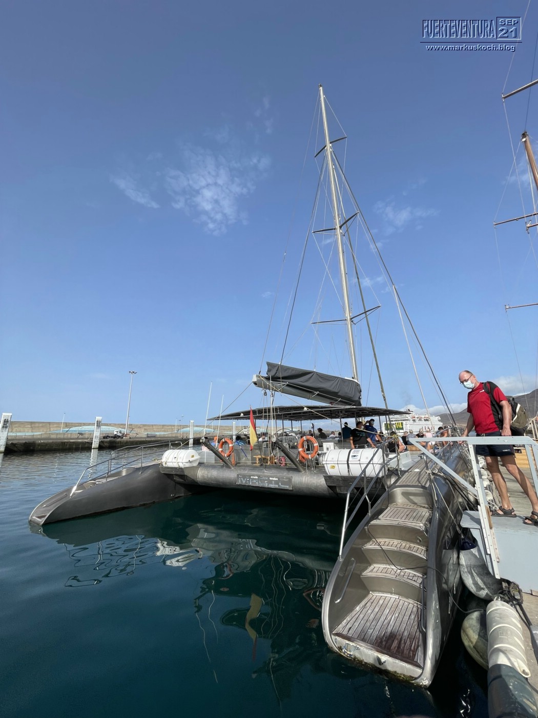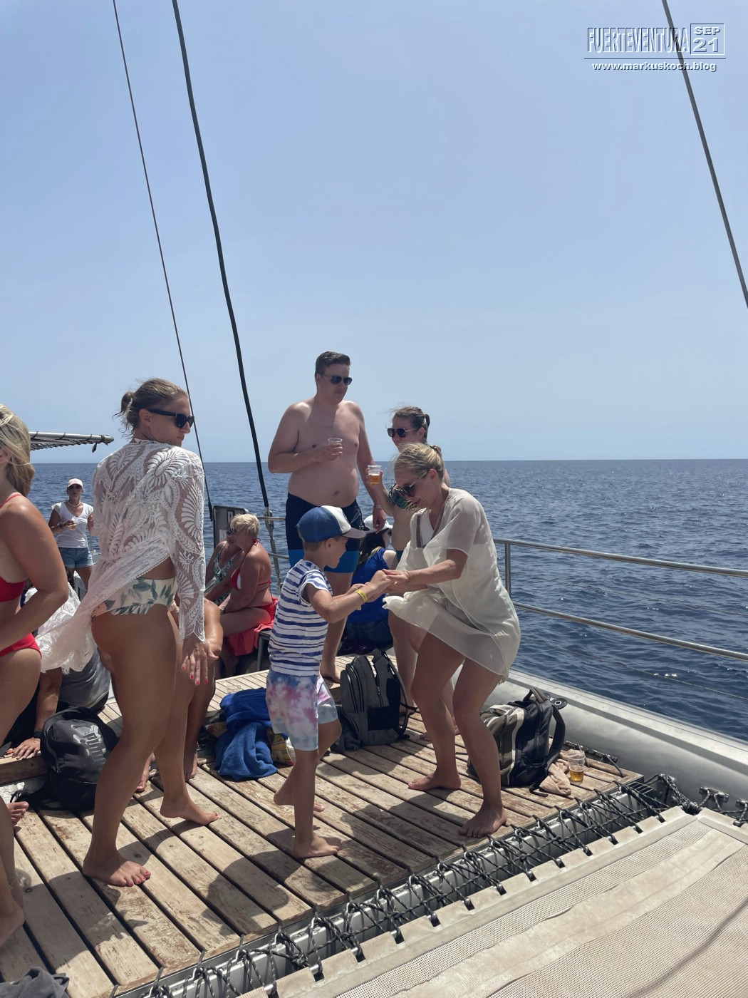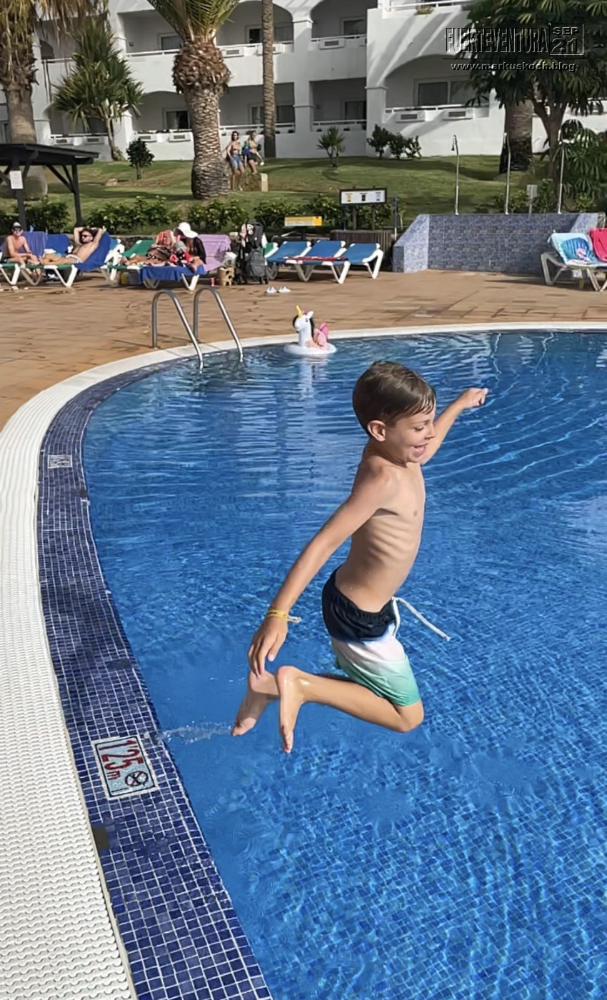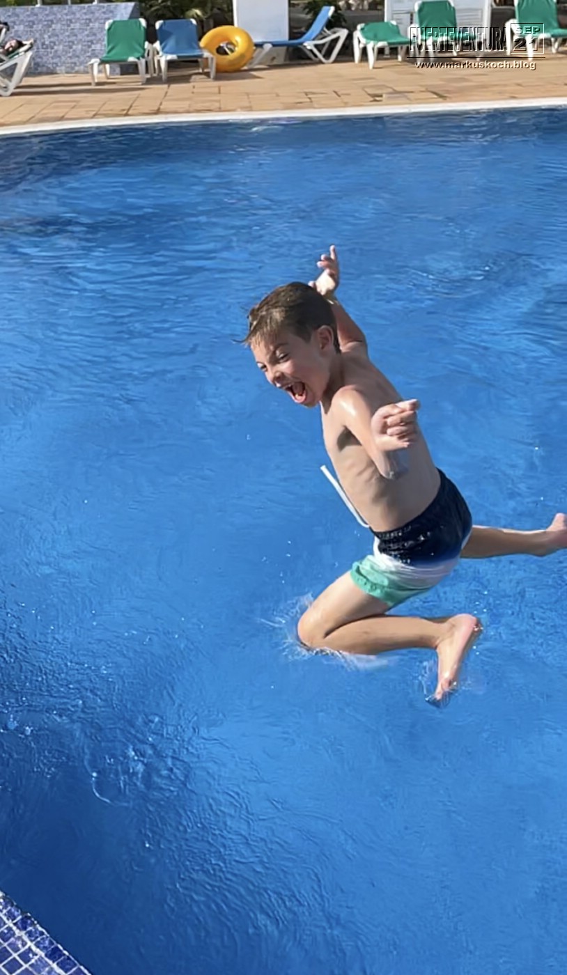Tatsächlich konnten wir Schweinswale & viele Delfine sehen. Dann konnten wir noch Mittagessen und im Meer baden. Luca ist sogar vom Katamaran ins Wasser gesprungen. Mit einer kleinen Partyrunde endete der Ausflug wieder im Hafen von Morre Jable. Ein gelungener Ausflug.
