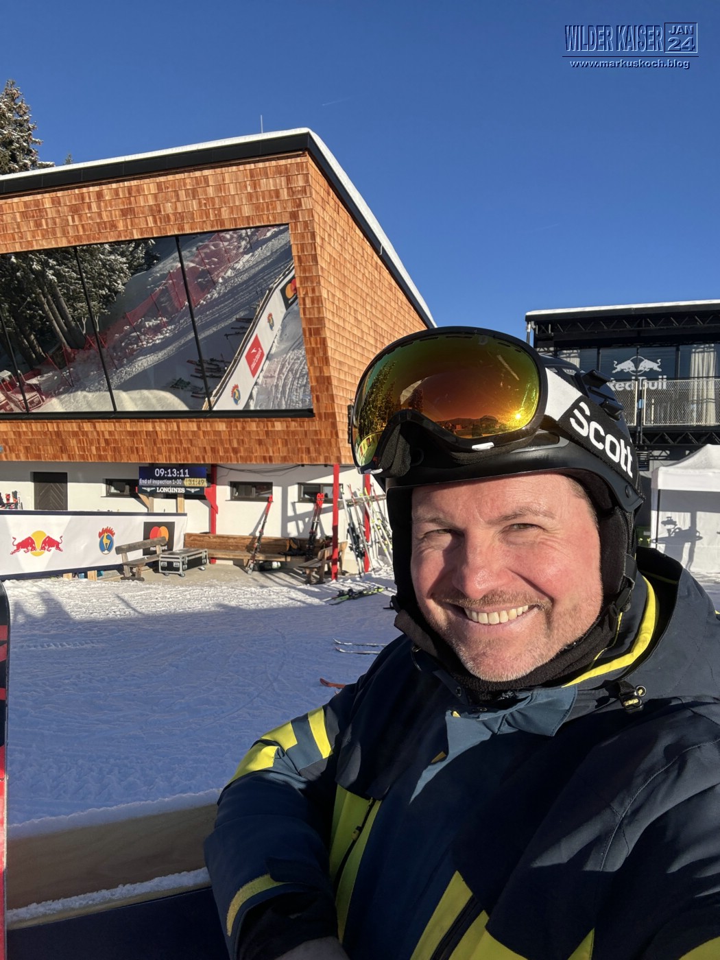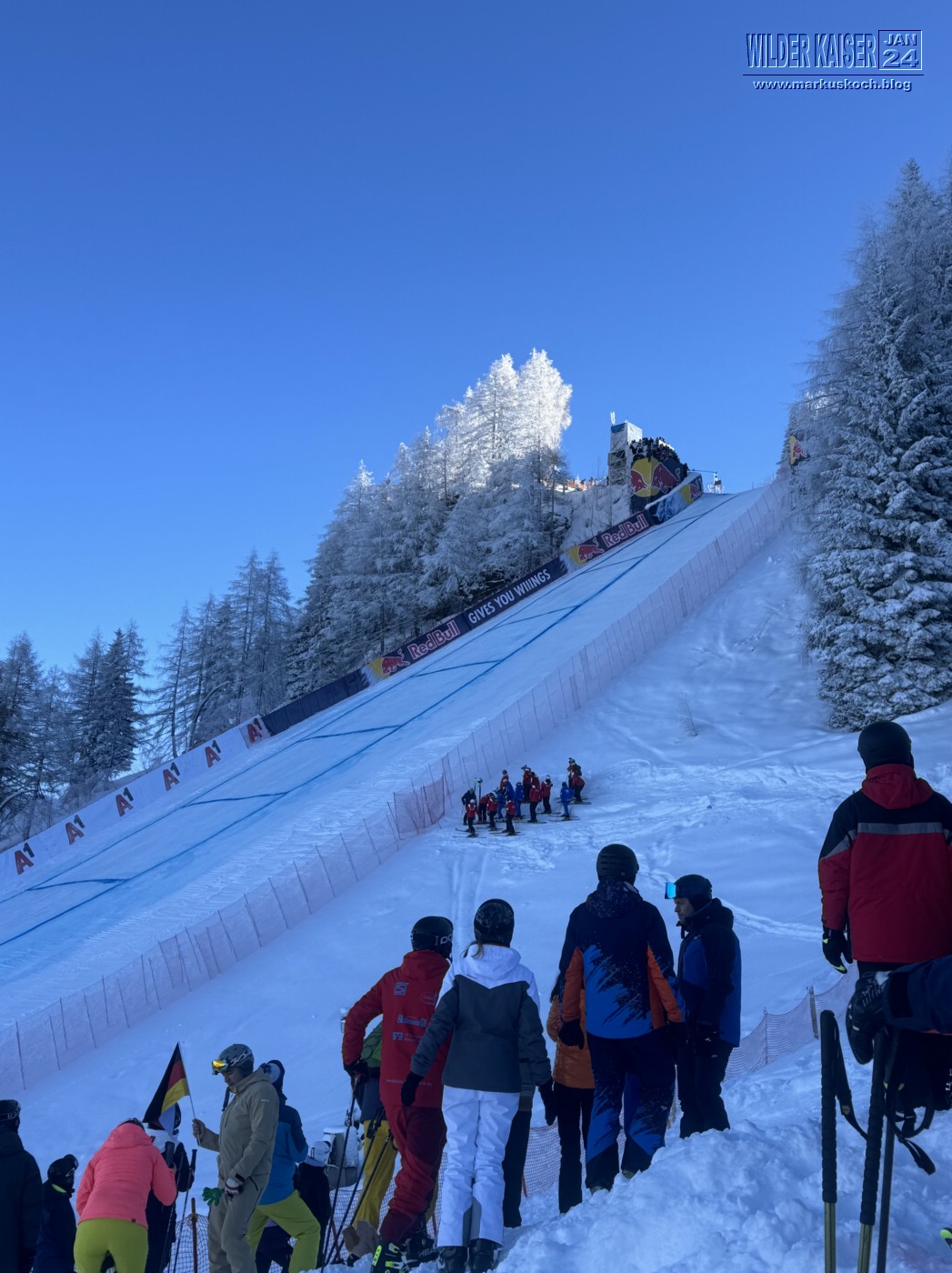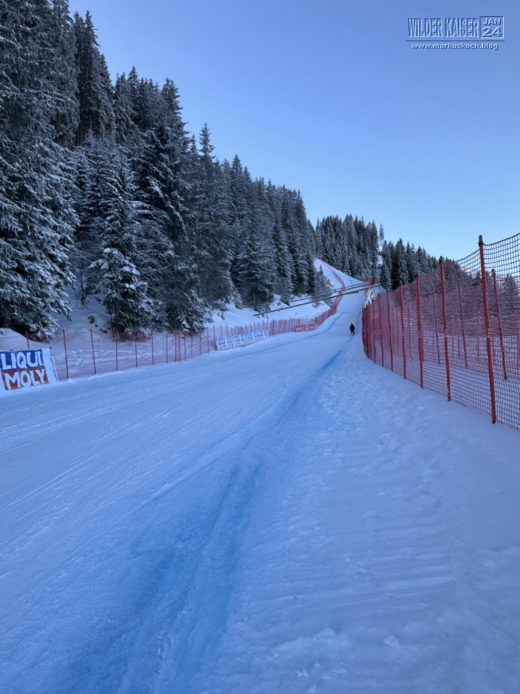 Heut war ich alleine, bzw. war zufälligerweise noch Ellen aus Aschaffenburg am Wilden Kaiser, am offiziellen Hahnenkammrennen mit einer Zuschauerkarte dabei. Gleich frühs starteten wir in Kirchberg und inspizierten die Streifabfahrt von oben bis unten. Wir konnten wirklich sehr nahe an der Piste stehen bzw. fahren.