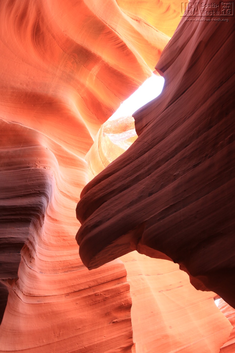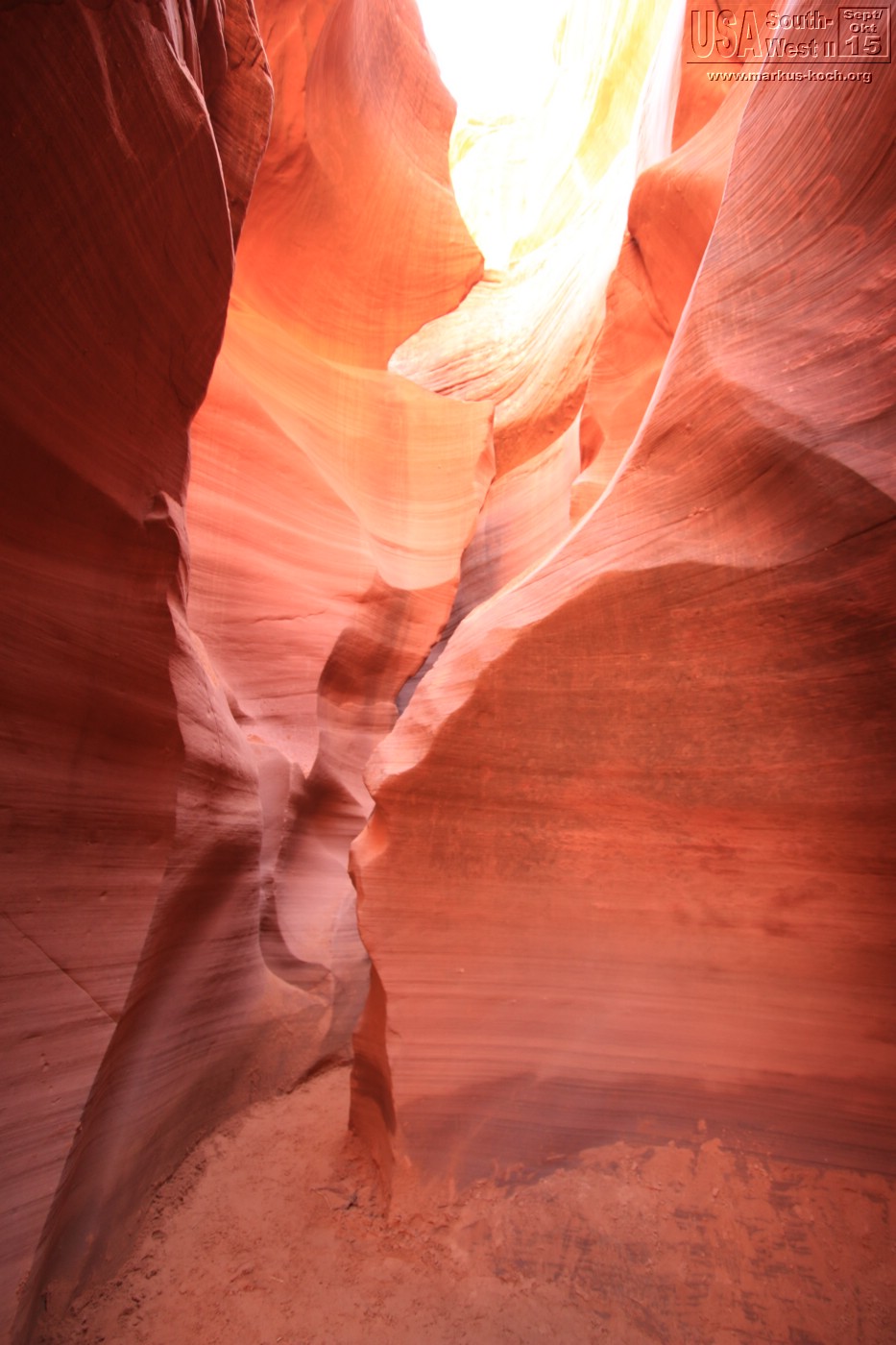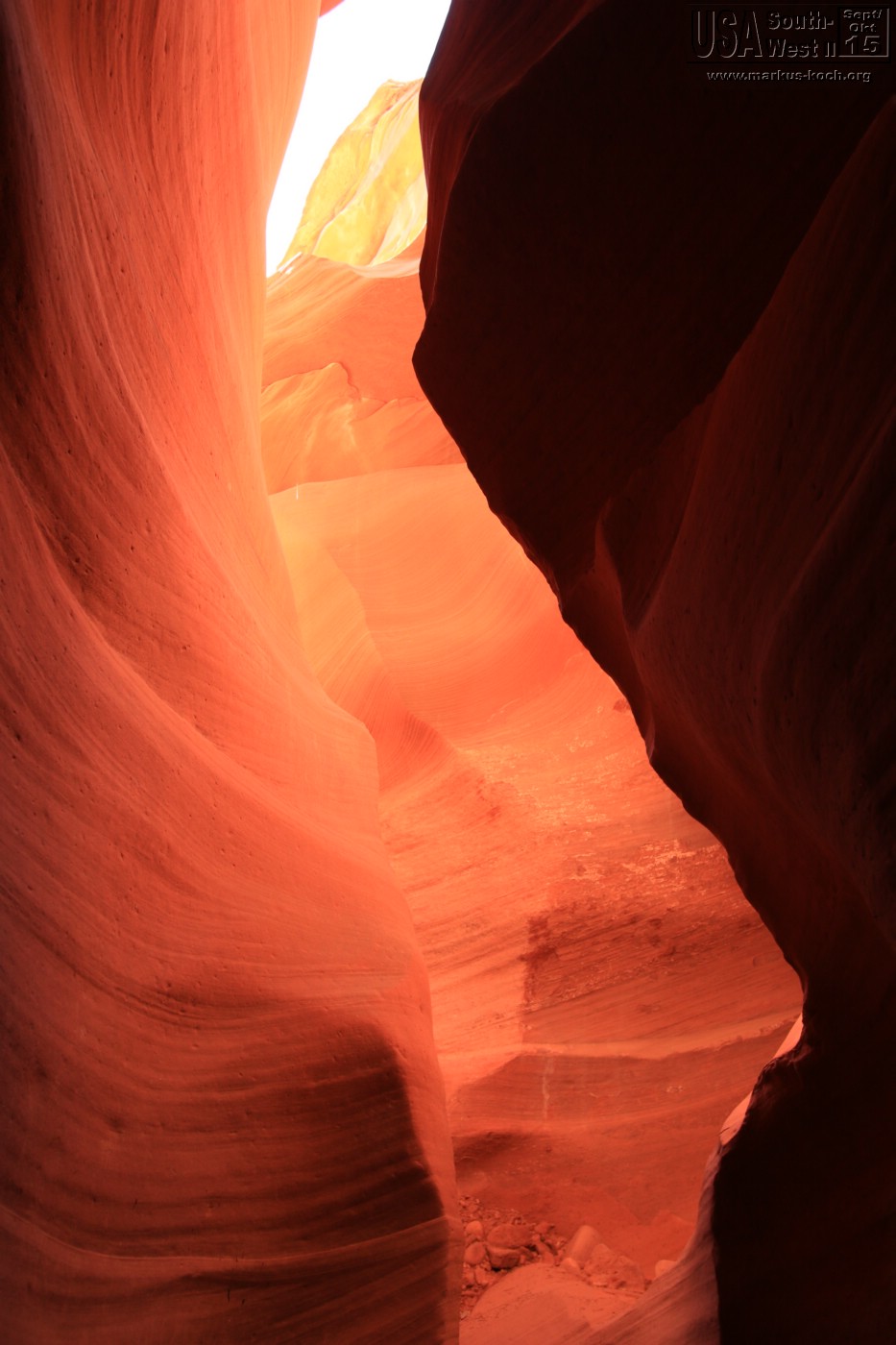 Nachdem der Lower Antelope Canyon wieder offen hatte, konnten wir nicht anders um doch einen Blick zu riskieren. $28 pErw. ärmer ging die Tour auch schon los. Über Treppen wurden wir zum Eingang gebracht, von wo es dann der „Schlucht“ entlang ging. Auch dieser war wunderschön! Heller und farbiger als der Upper tags zuvor.