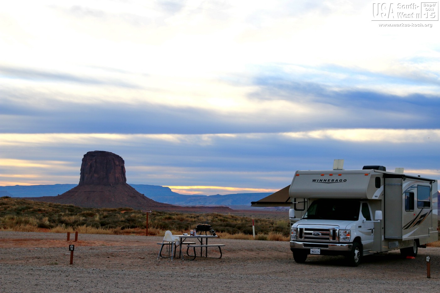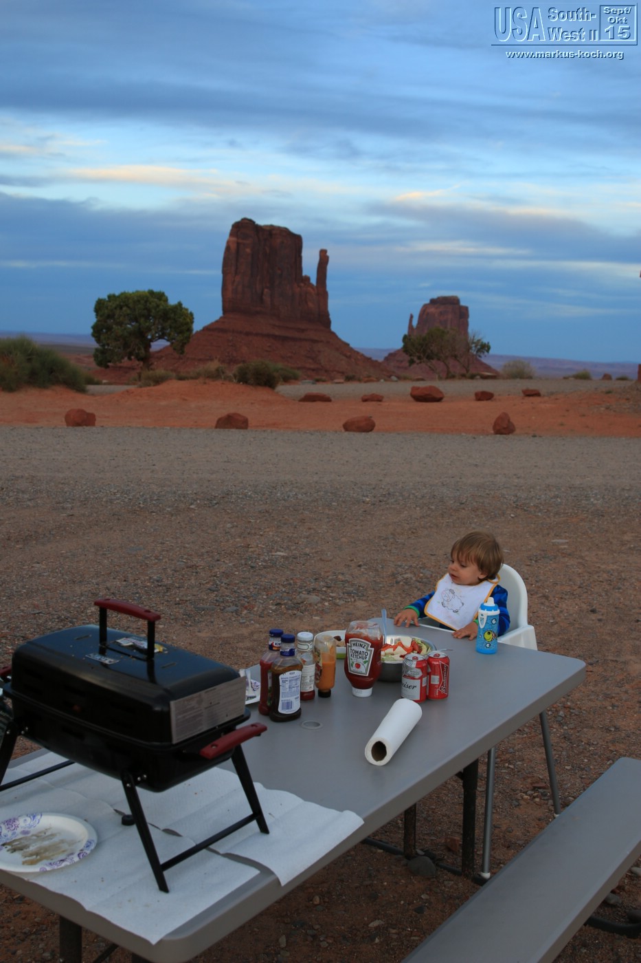 Weiter ging es ins Monument Valley. Der CG dort ist genial – direkt mit Blick auf die Buttes! So kann der Abend mit gegrillten Würstchen ausgehen!