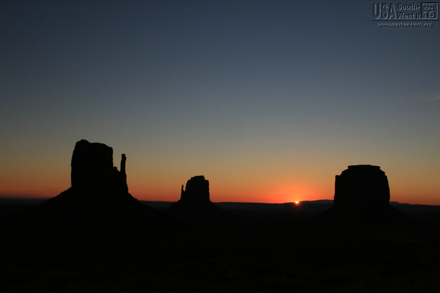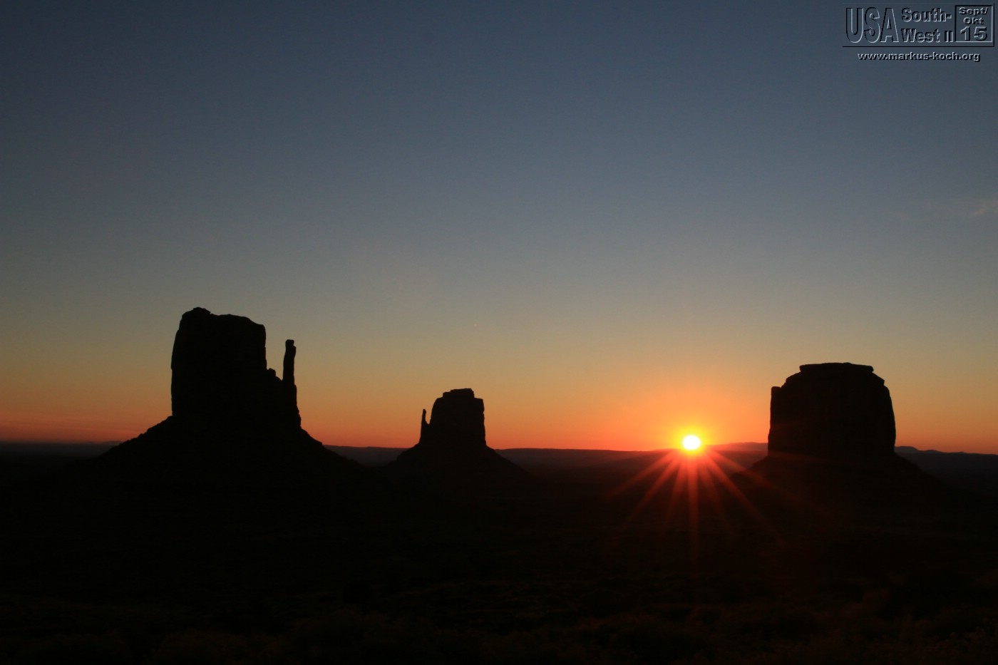 Ich stand pünktlich zum Sonnenaufgang auf, um ihn direkt vor den bekannten Buttes auf Bildern festzuhalten. Nur ein paar wenige Camper krochen noch aus ihren WoMo’s oder Zelten. Etwas entfernt – nicht wirklich toll, aber halt Tourismus – ein ganzer Bus voller Asiaten 😉