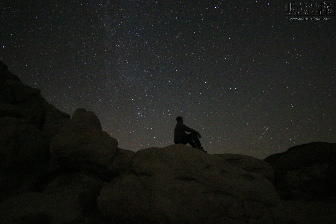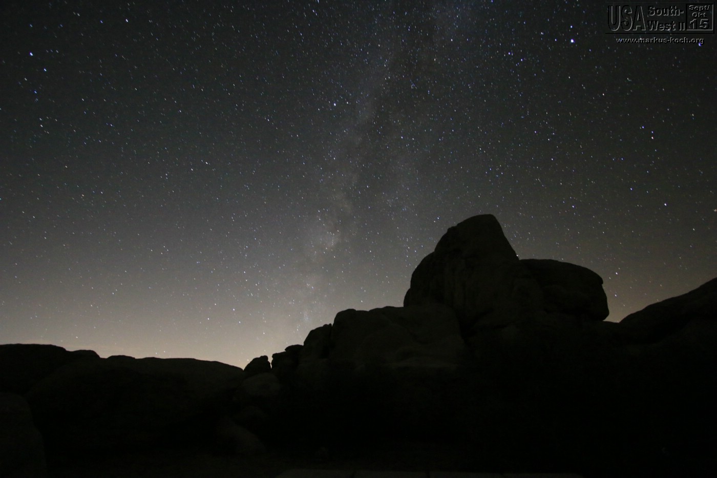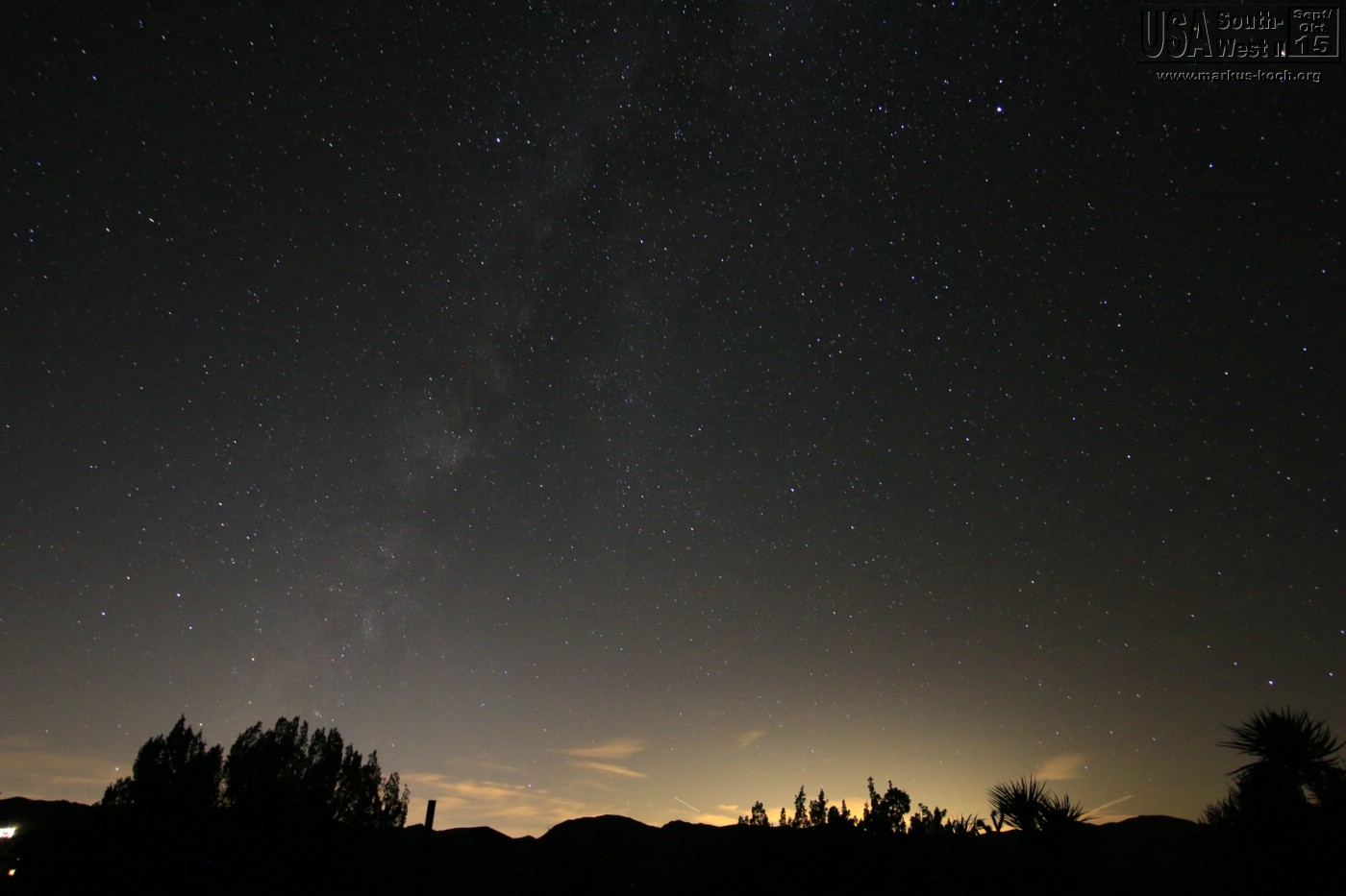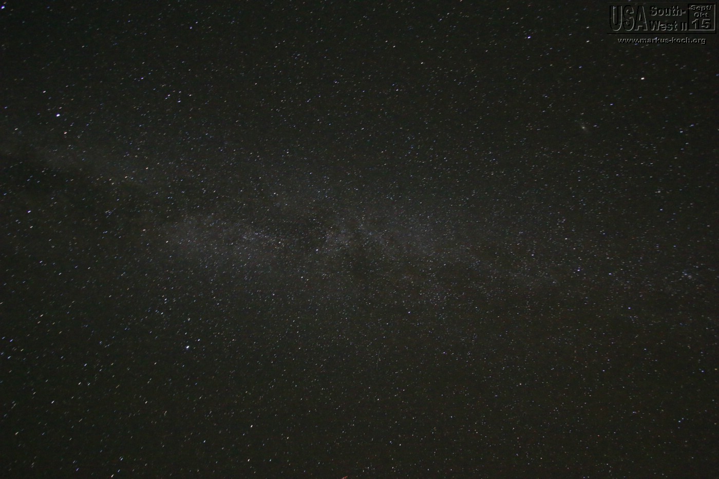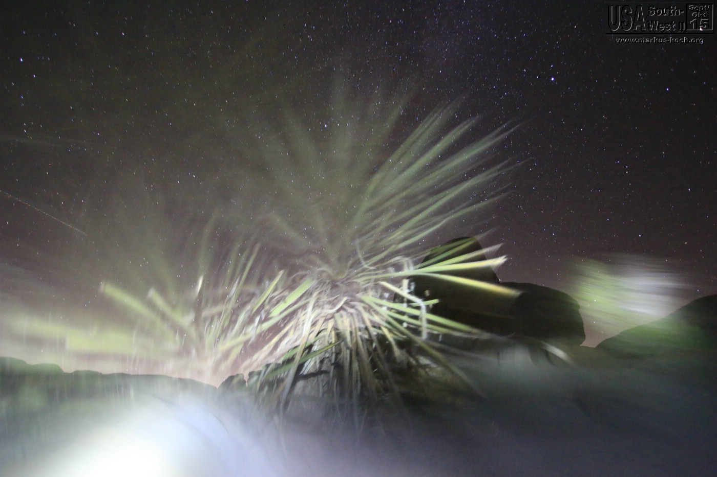 Nach einer Weile heulte es in nicht allzu weiter Ferne zu mir und es wurde immer lauter und ich vermutete, dass es auch mehrere waren. Nur was war es? Ich denke es waren Coyoten vor denen ich ganz ganz ganz schnell vor Angst die 100 m zurück zum RV rannte. Und das mit Fotoequipment – es war stockfinster! Genau dabei ist das letzte Bild entstanden, das eigentlich noch einer Aufnahme des Sternenhimmels galt 🙂 Raus traute ich mich in der Nacht nicht mehr. Normal bin ich nicht so n Schisser, aber das hörte sich echt fies an!