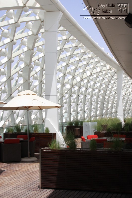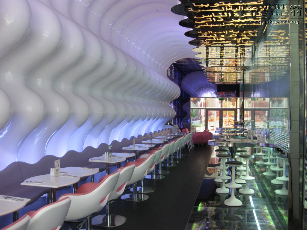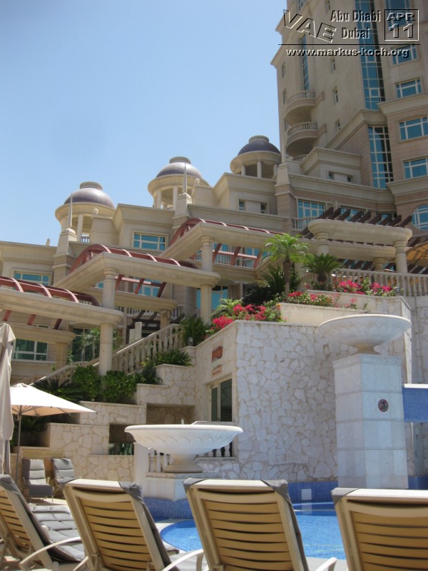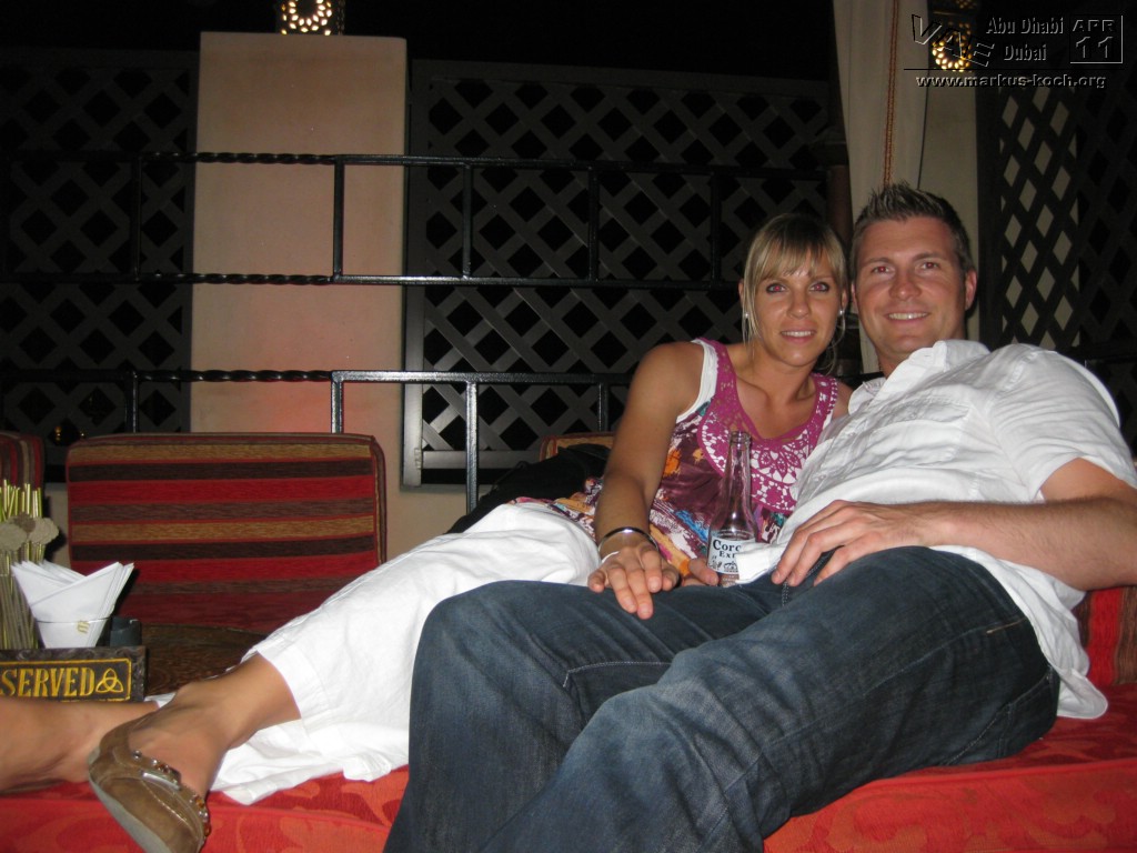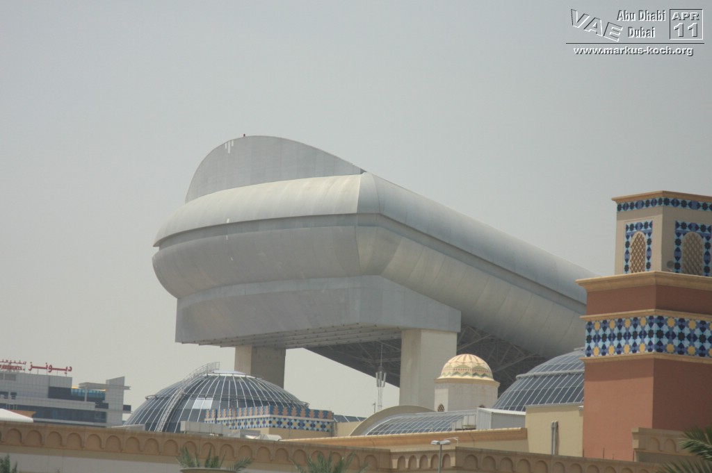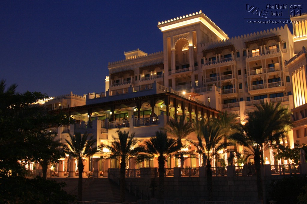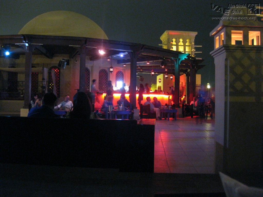 Zurück mit der Monorail und weiter mit dem Taxi zum Madinat Jumeirah. Ein riesiger Hotelkomplex mit 2 eleganten Luxushotels die durch Kanäle miteinander verbunden sind. Das Hotel „Mina a Salam“ ist einer arabischen Stadt nachgebildet. Es gibt auch ein großes Theater und einen Souk; in 70 Läden kann man ganz gut Souveniers – hier allerdings zu Festpreisen – einkaufen. Dazu gehört auch das Trilogy. Dies ist wohl der berühmteste und größte Nachtclub Dubais.