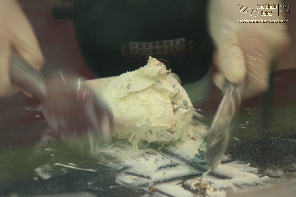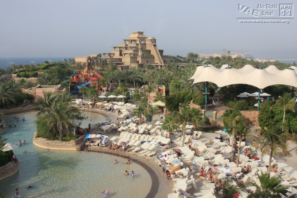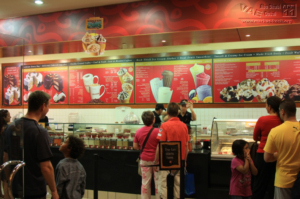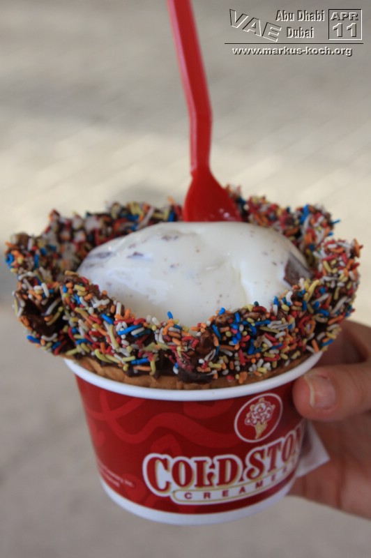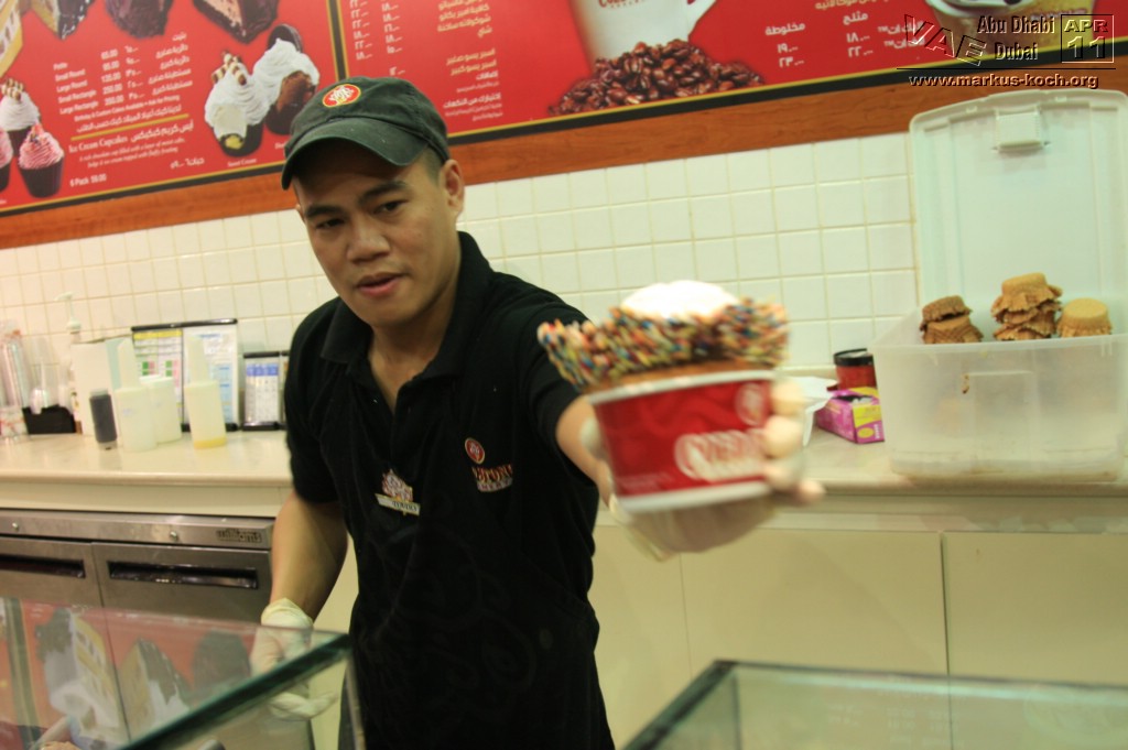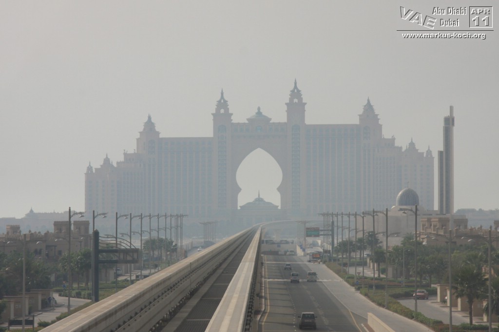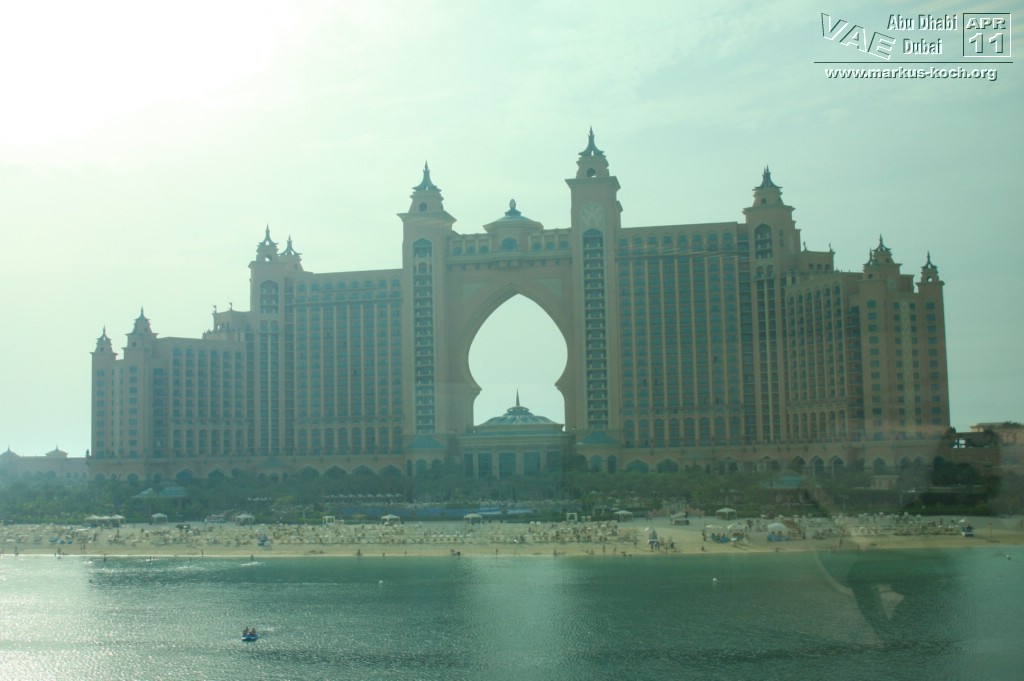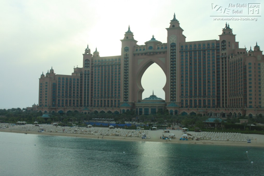 Jedoch gibt es auch eine Metro (hauptsächlich überirdisch) welche wir nach der kurzen Pause Richtung Palm Jumeirah nutzten. Allerdings dauerte es eine Weile zu Fuß zur Metro Station um dann für 4 Euro in die Nähe der Monorail zum Atlantis Hotel zu fahren. Hätten wir ein Taxi genommen, wären wir schneller, günstiger und einfacher – vor allem auch klimatisierter dort angekommen. Nun gut. Das Atlantis-Hotel hat für Besucher nicht allzu viel zu bieten, wenn man nicht in den Wasserpark geht. Das beste war die Eisdiele (Cold Stone) am Eingang zum „Besuchertrackt“ – sehr zu empfehlen 😉