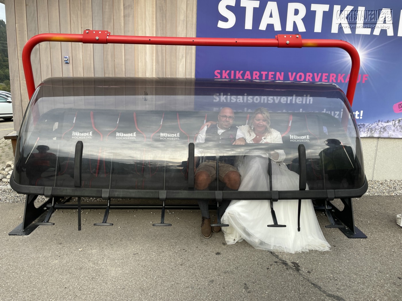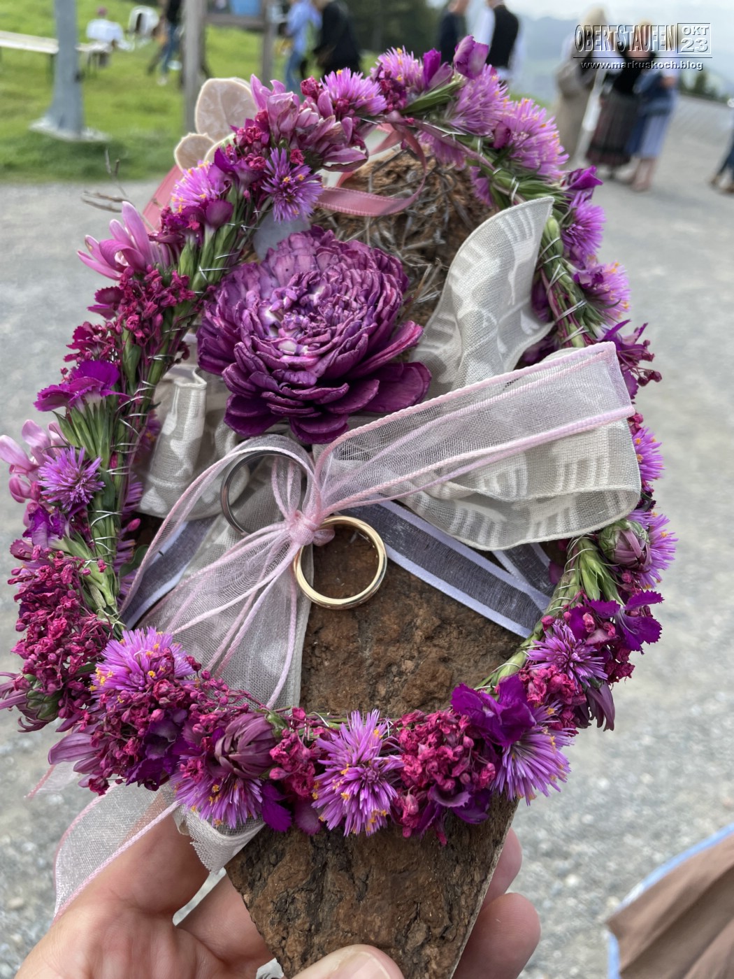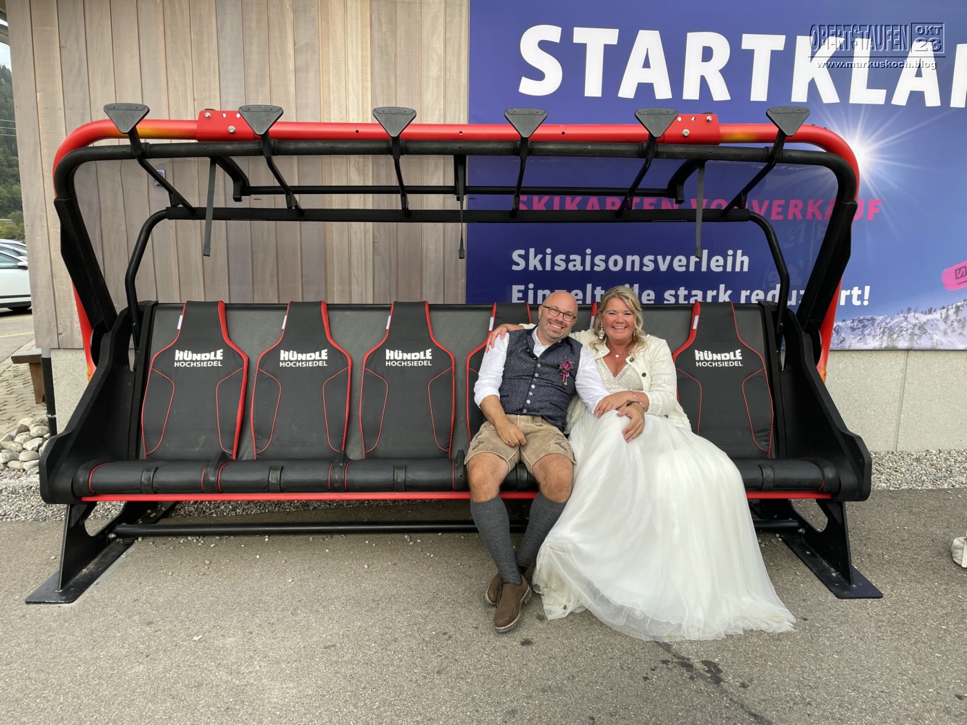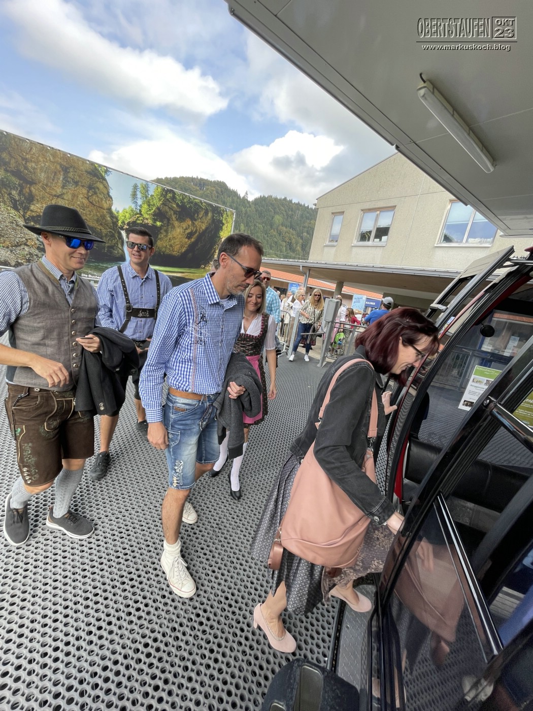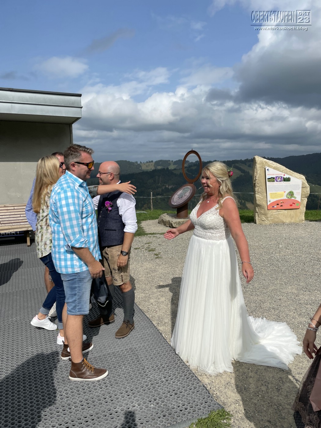 Es kam etwas anders als gedacht, wir wurden alle überrascht – MaZe & Kirstin hatten sich heimlich verlobt und tarnten die Geburtstagsfeier als ihre Hochzeit. Wahnsinn! Wir stiegen aus der Gondel aus und da standen die Beiden – sie im Hochzeitskleid & er in super schöner Tracht.