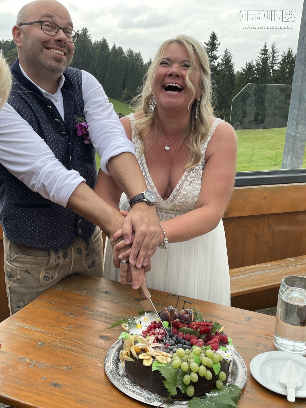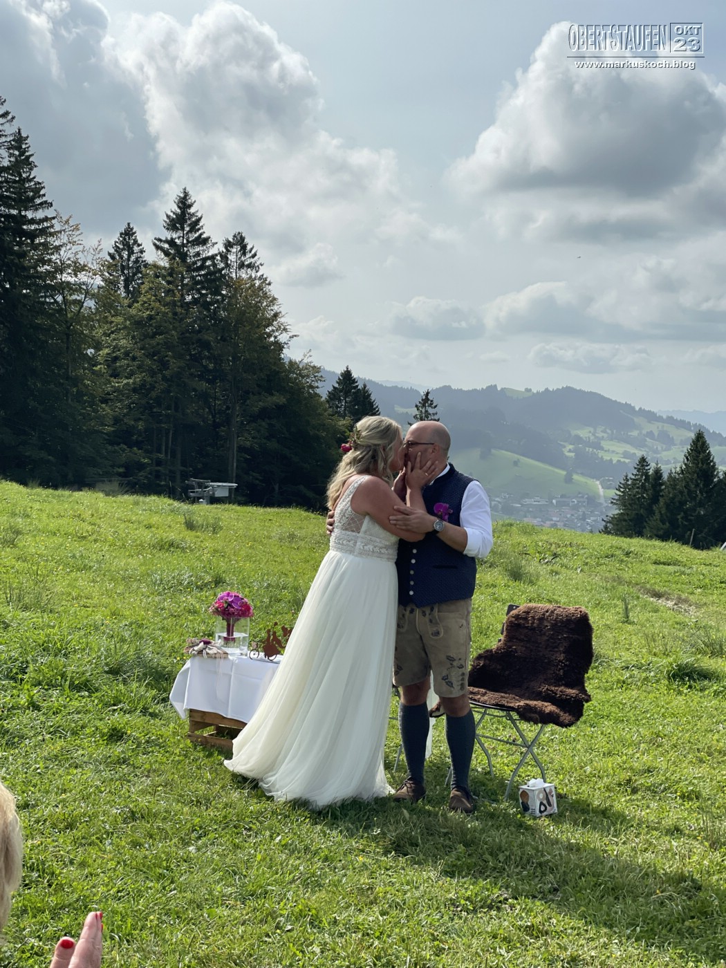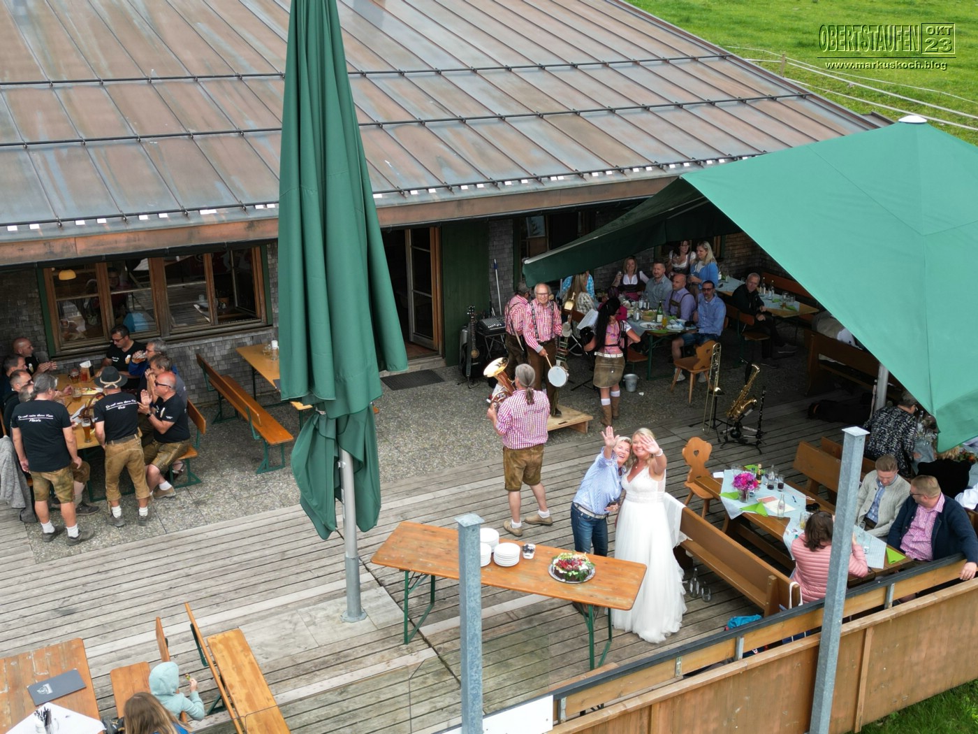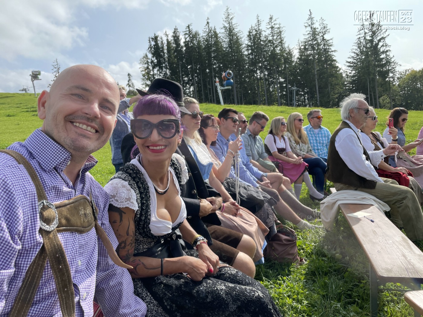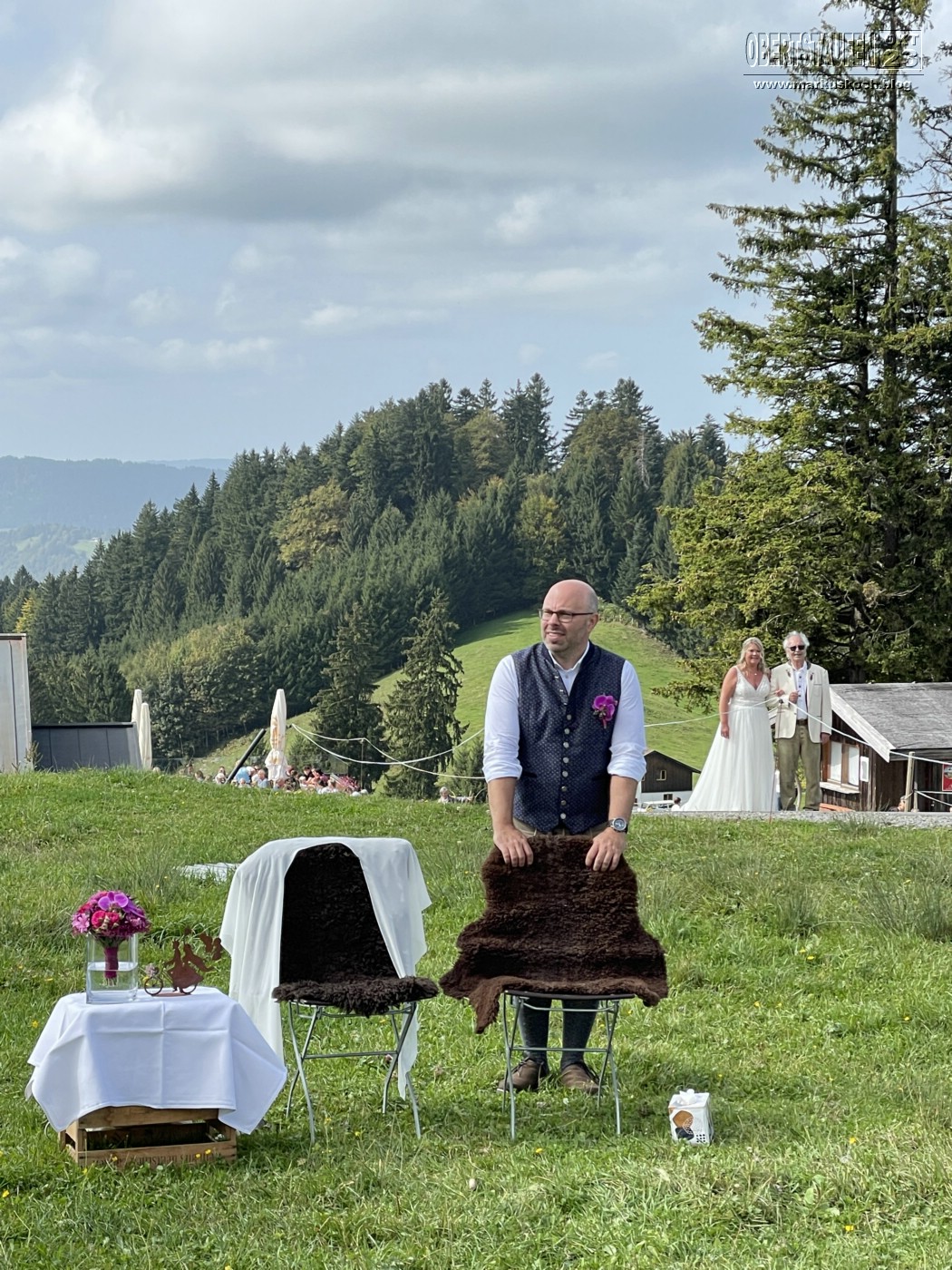 Es kam etwas anders als gedacht, wir wurden alle überrascht – MaZe & Kirstin hatten sich heimlich verlobt und tarnten die Geburtstagsfeier als ihre Hochzeit. Wahnsinn! Wir stiegen aus der Gondel aus und da standen die Beiden – sie im Hochzeitskleid & er in super schöner Tracht.