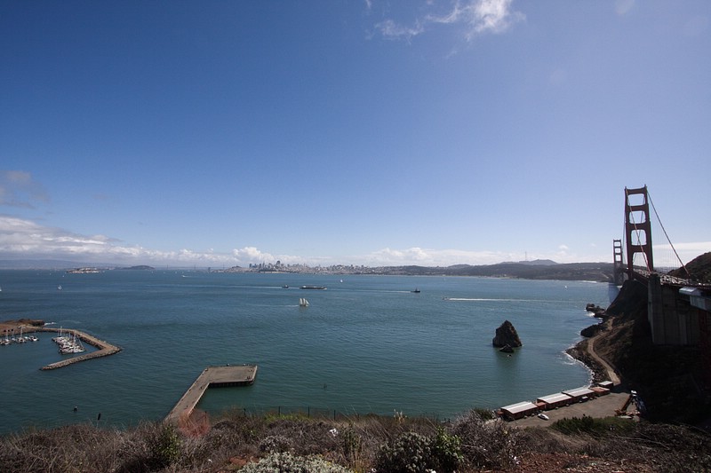 Zurück am Wagen fuhren wir an den Grünanlagen vorbei zur Golden Gate Bridge. Erst waren wir unterhalb der Brücke bis am Fort Point direkt unter „ihr“. Von dort wurde die Bay mit Kanonen gesichert. Dann starteten wir über die Brücke – echt fantastisch – nach Sausalitos. Eine super schöne Stadt mit echt genialen Häusern in den Hügeln und am Wasser. Hier sahen wir auch die Bootshäuser, die von den Hippies in den 70er Jahren hauptsächlich besiedelt waren.